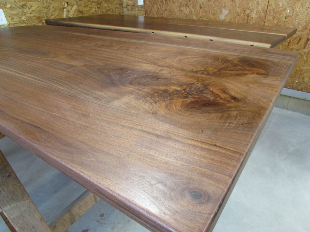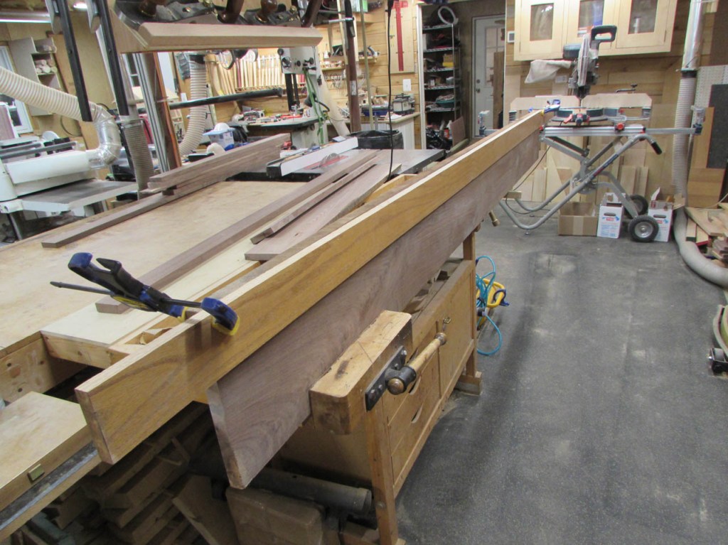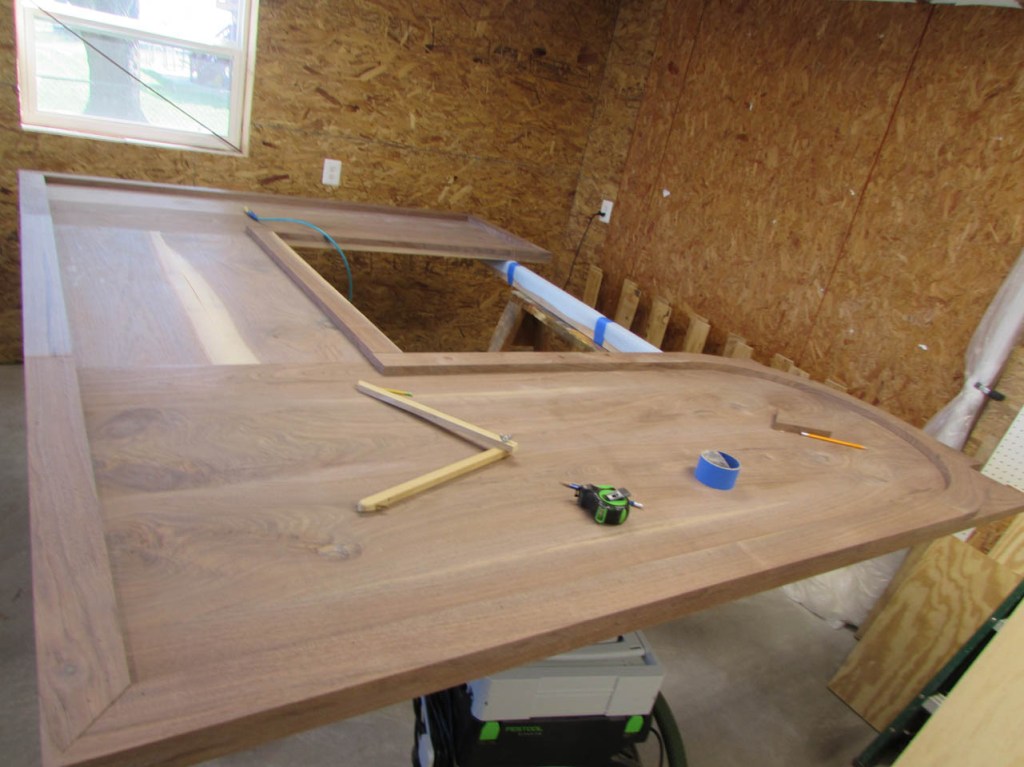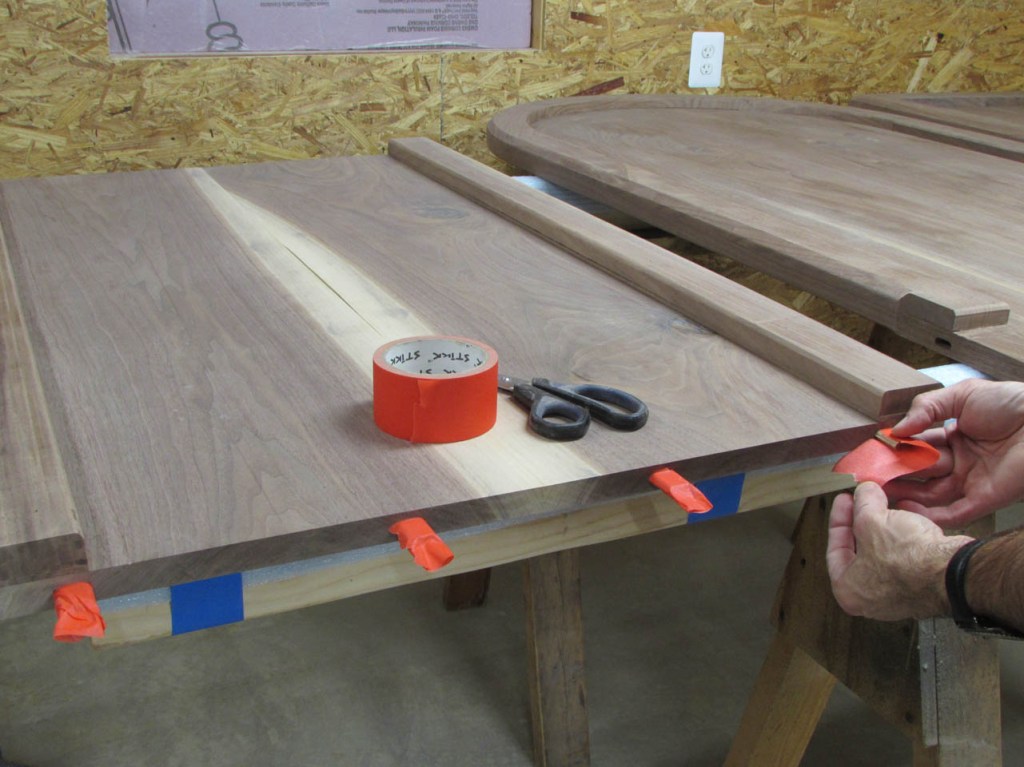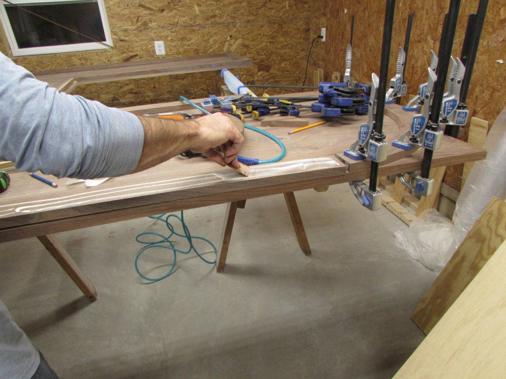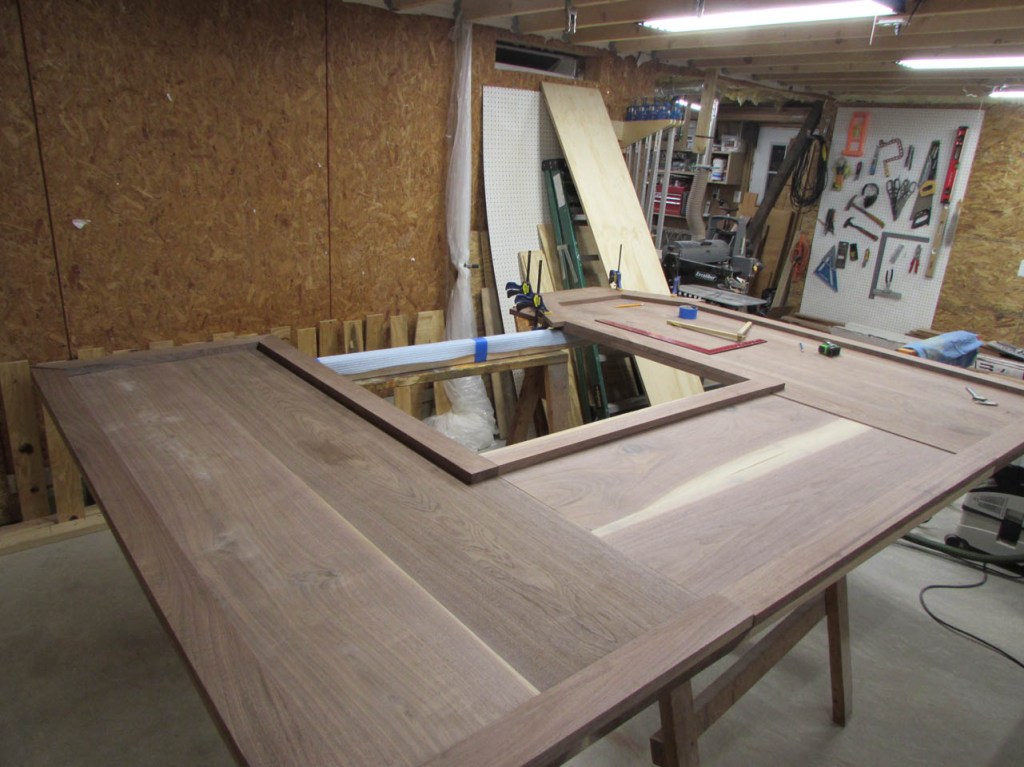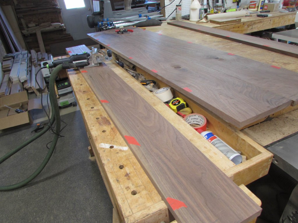 My wife took pity on me and came down to help sweep and vacuum the area. I adjusted the saw horses and placed the tops on them, upside down. In case you were wondering, to extend the length of the saw horses, I screwed two 8′ long 2″x4″s on edge, then wrapped them with some left over foam sill sealer. This gave me a soft surface to avoid marring the finished walnut. And, yes, I did learn that you need to leave the heaviest section in the middle or the entire thing will fall over if you remove too much weight from one side. I did not take a picture of that lesson…