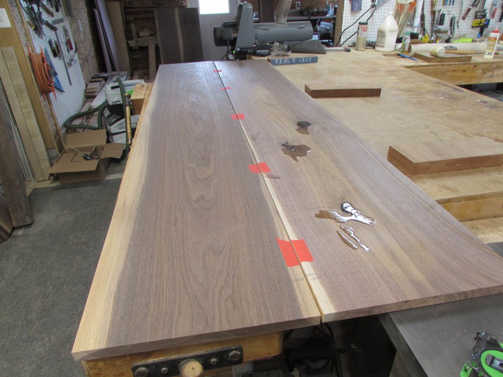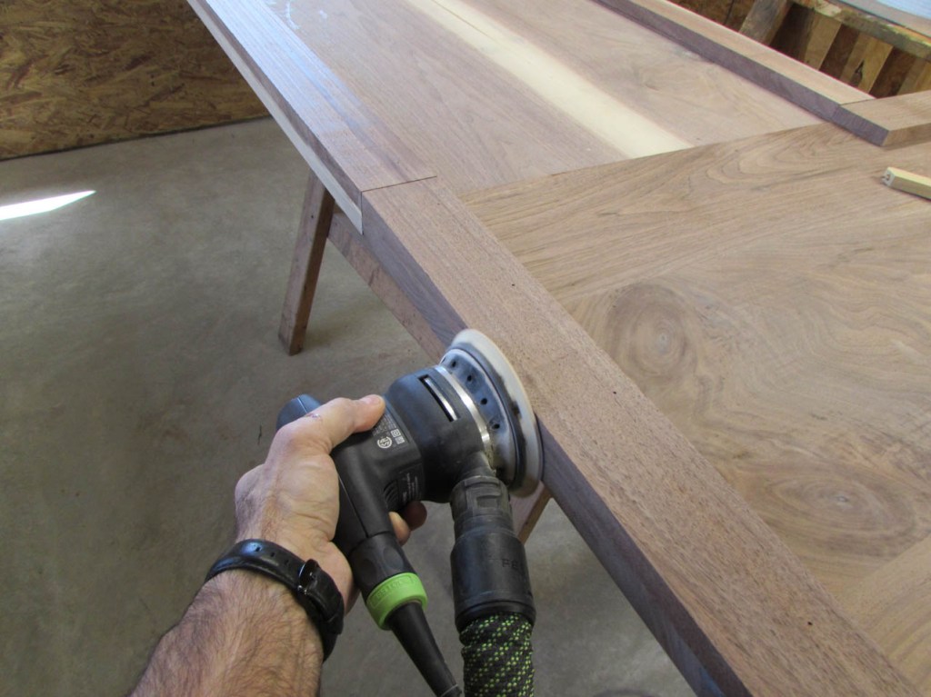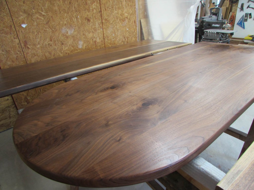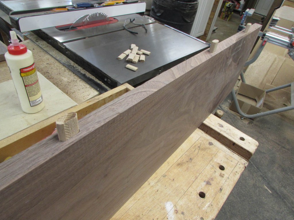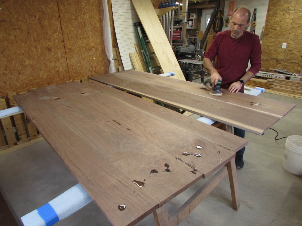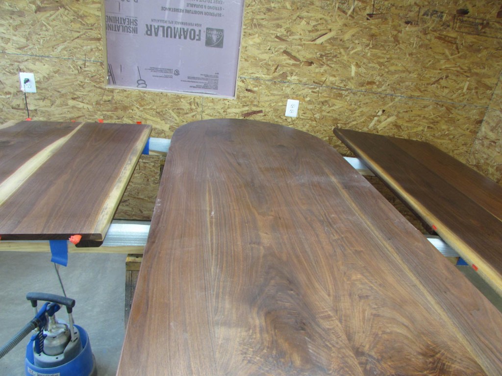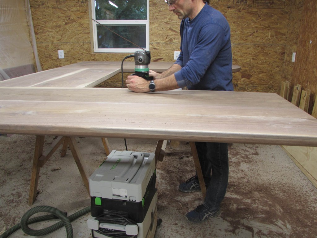 My wife took pity on me and came down to help sweep and vacuum the area. I adjusted the saw horses and placed the tops on them, upside down. In case you were wondering, to extend the length of the saw horses, I screwed two 8′ long 2″x4″s on edge, then wrapped them with some left over foam sill sealer. This gave me a soft surface to avoid marring the finished walnut. And, yes, I did learn that you need to leave the heaviest section in the middle or the entire thing will fall over if you remove too much weight from one side. I did not take a picture of that lesson…