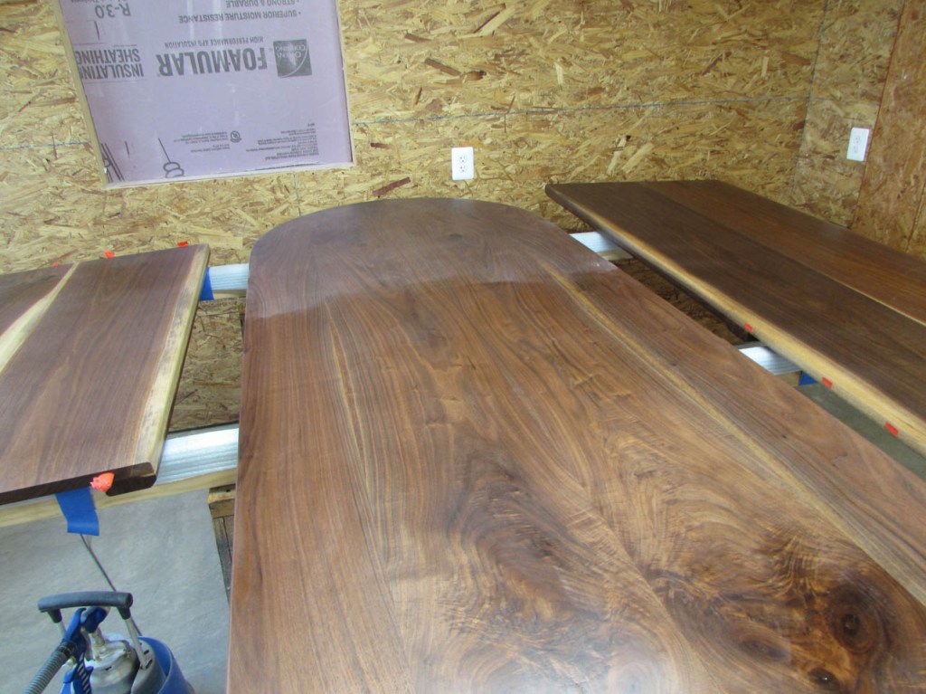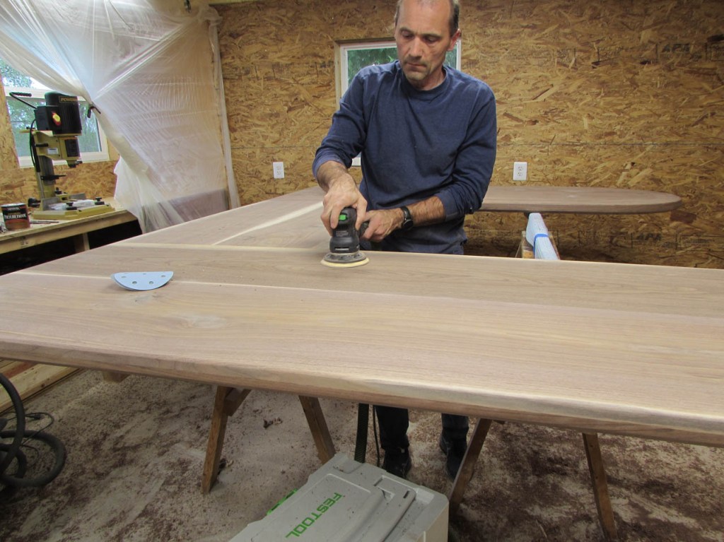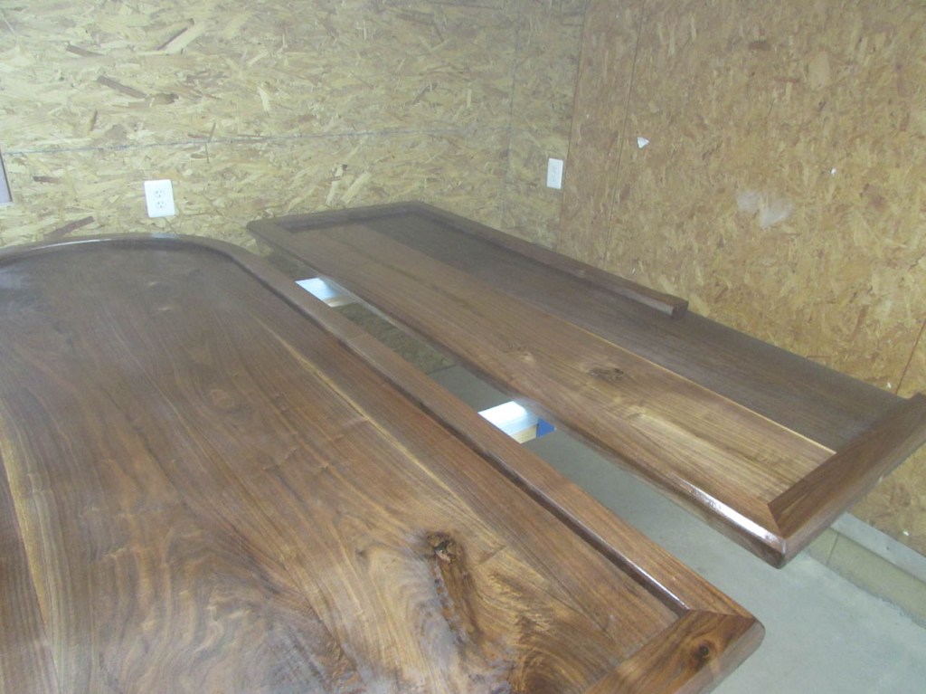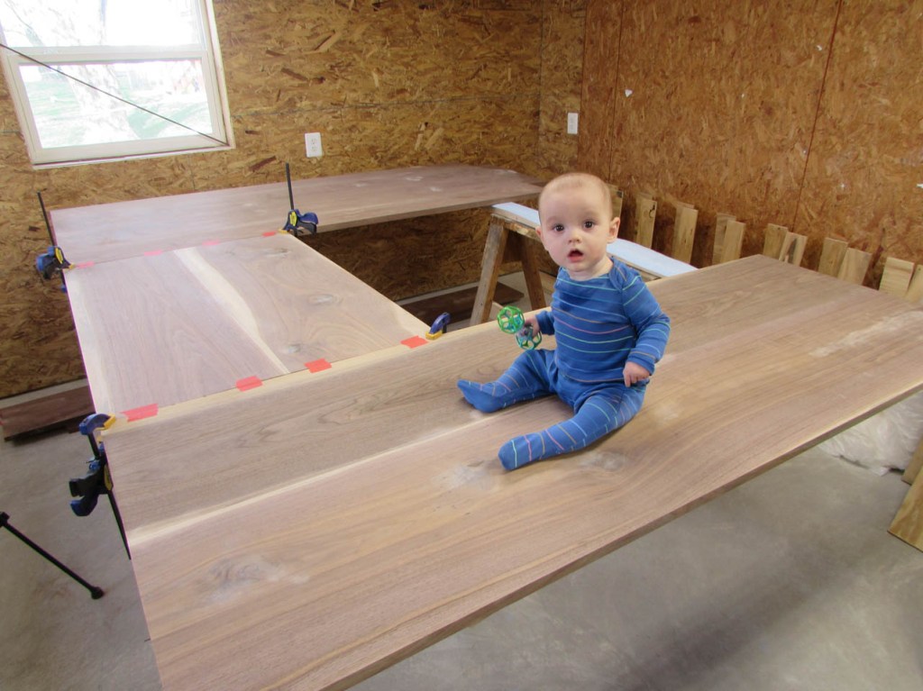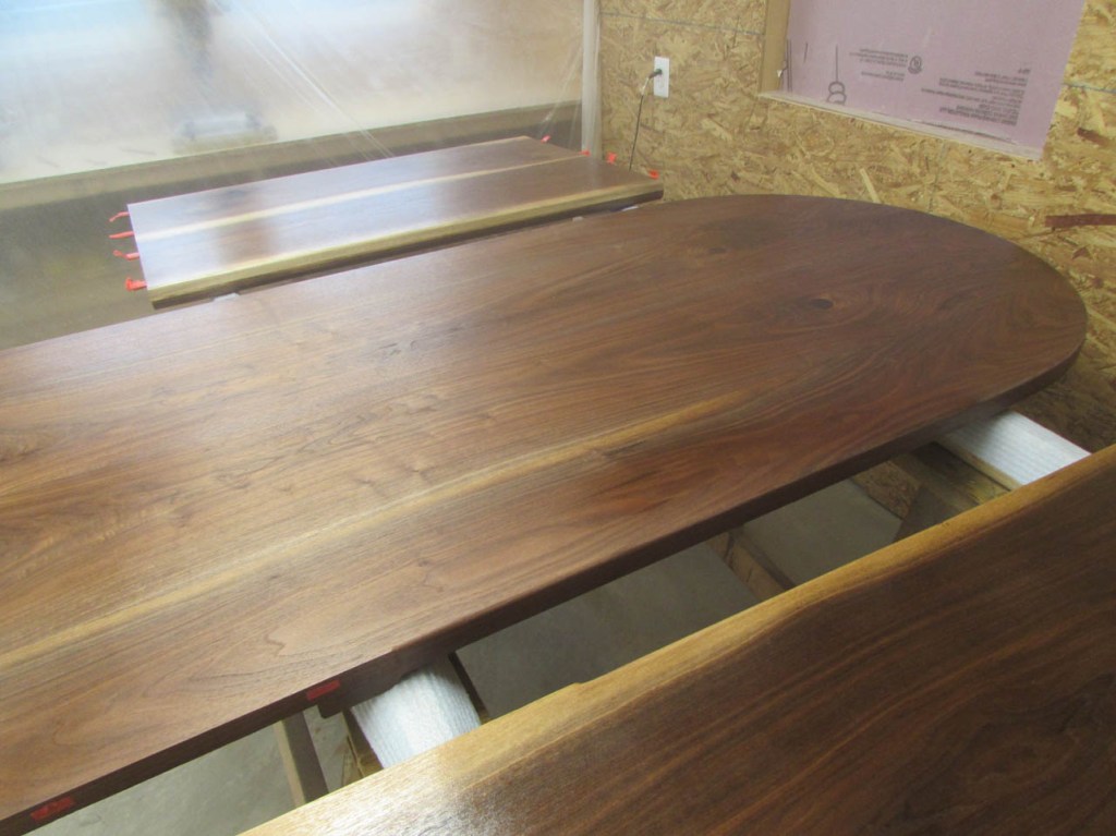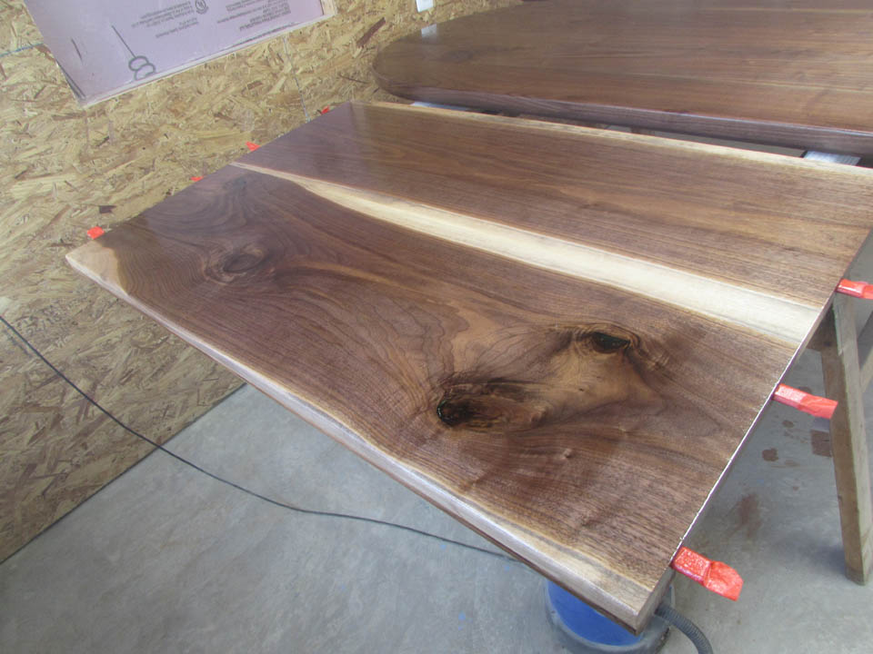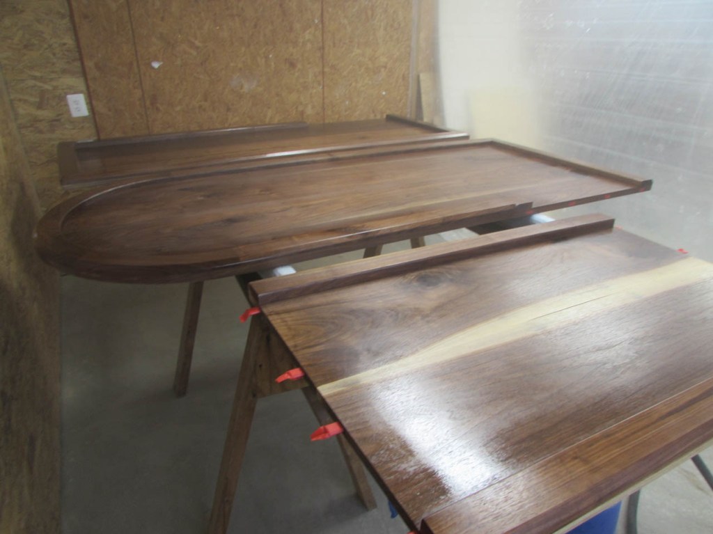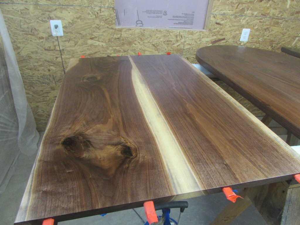 My wife took pity on me and came down to help sweep and vacuum the area. I adjusted the saw horses and placed the tops on them, upside down. In case you were wondering, to extend the length of the saw horses, I screwed two 8′ long 2″x4″s on edge, then wrapped them with some left over foam sill sealer. This gave me a soft surface to avoid marring the finished walnut. And, yes, I did learn that you need to leave the heaviest section in the middle or the entire thing will fall over if you remove too much weight from one side. I did not take a picture of that lesson…