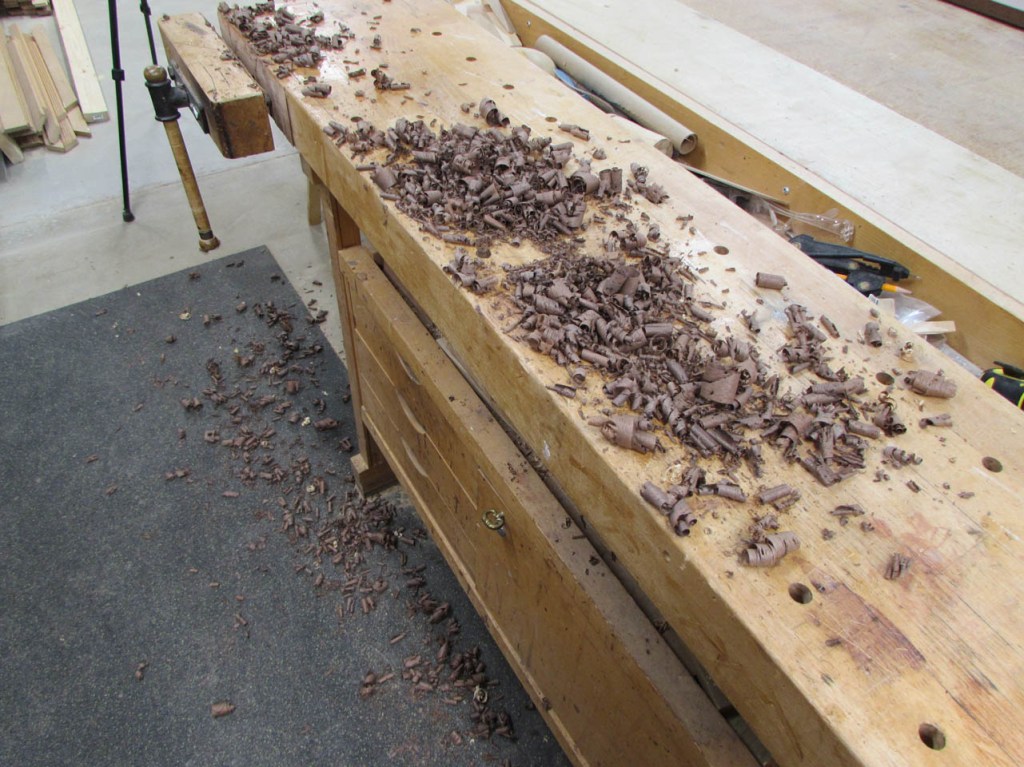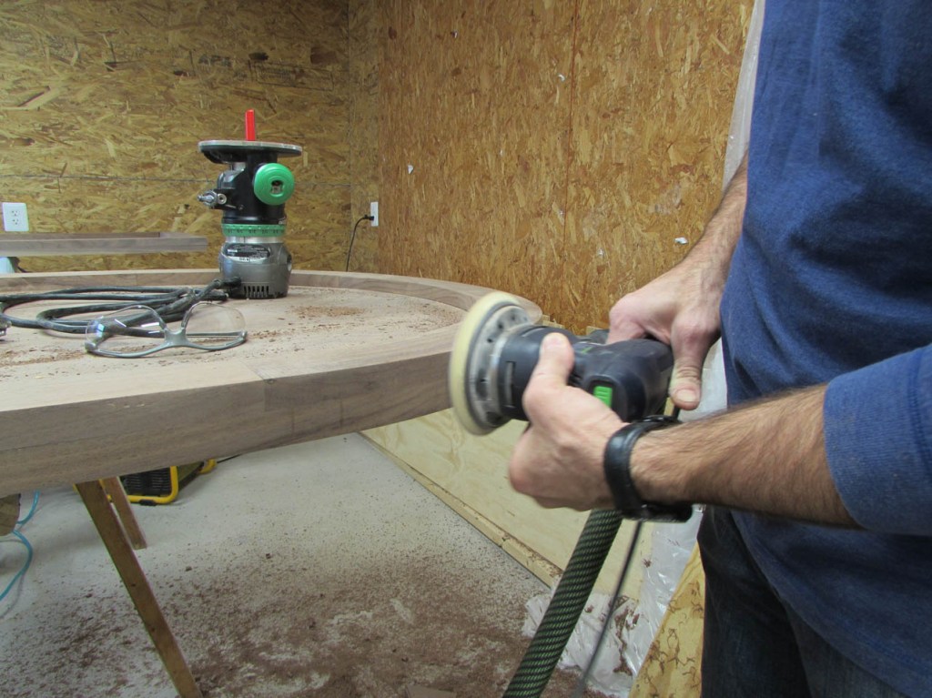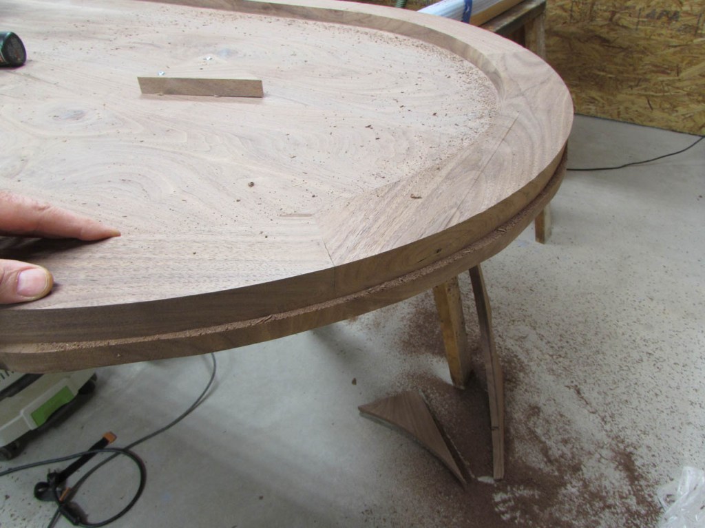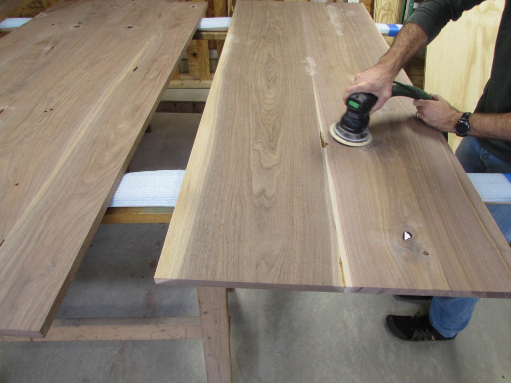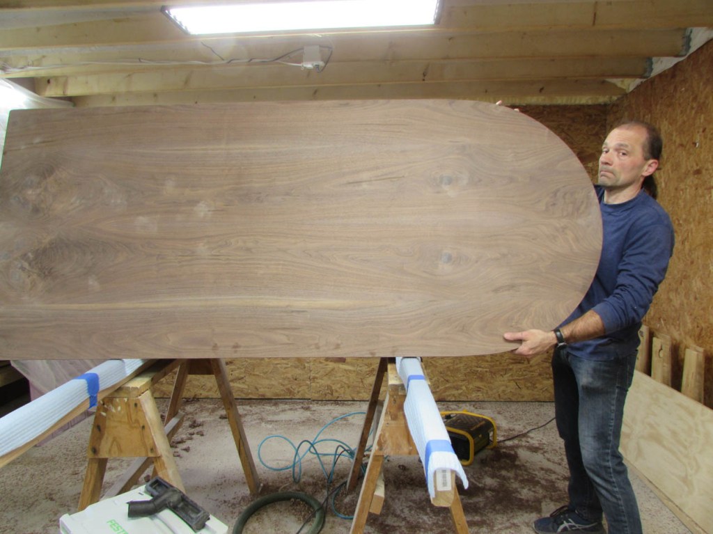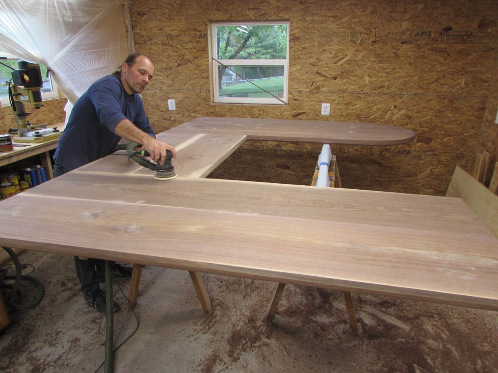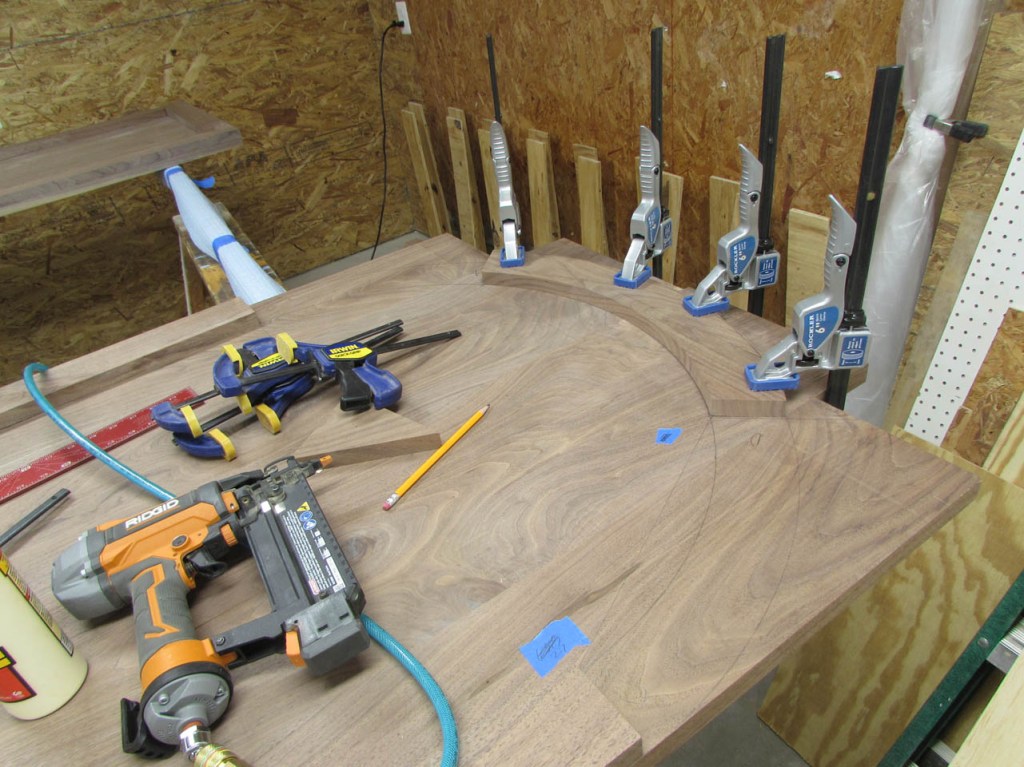 My wife took pity on me and came down to help sweep and vacuum the area. I adjusted the saw horses and placed the tops on them, upside down. In case you were wondering, to extend the length of the saw horses, I screwed two 8′ long 2″x4″s on edge, then wrapped them with some left over foam sill sealer. This gave me a soft surface to avoid marring the finished walnut. And, yes, I did learn that you need to leave the heaviest section in the middle or the entire thing will fall over if you remove too much weight from one side. I did not take a picture of that lesson…
