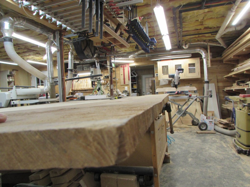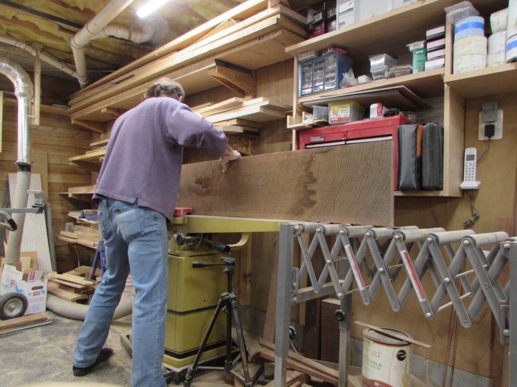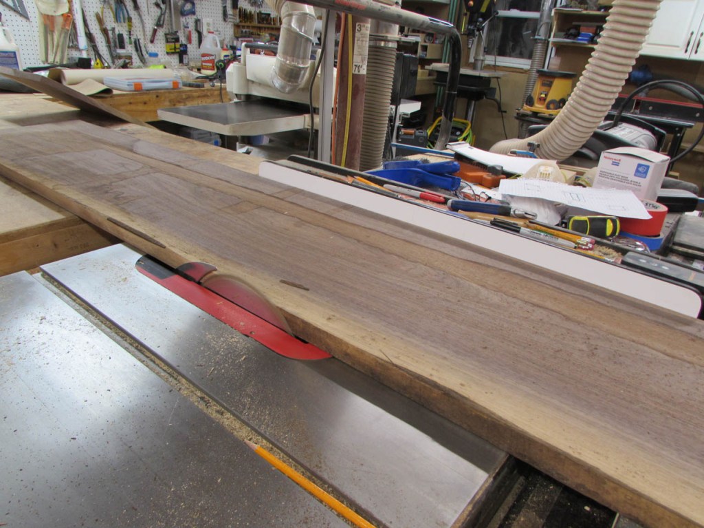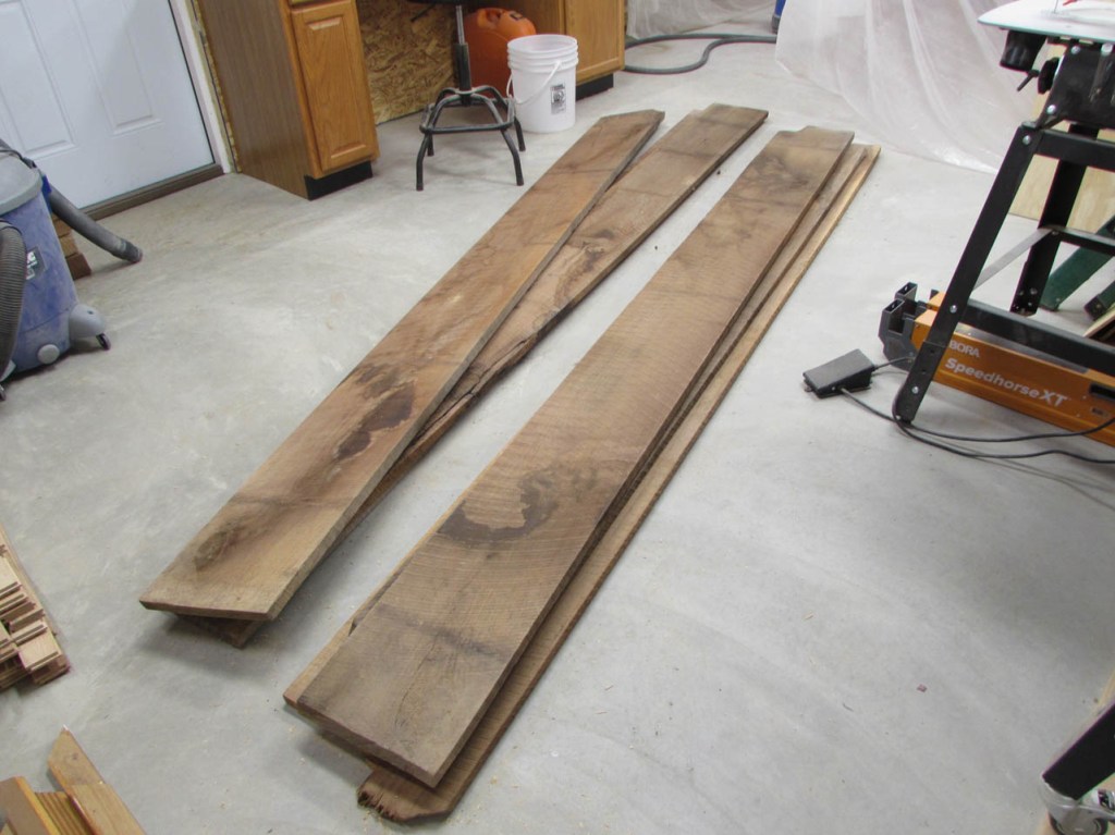 I thought about making the desk out of cherry to match the walls, but I get morning sun through the window on the left and cherry will get darker in the sun. Whatever I have on the desk will leave tan lines. I don’t have access to a lot of maple (to match the floor) and I don’t think it would look right blending in with the floor anyway. So, I decided on walnut for the desk top and shelves below to match the walls. I can get some beautiful air-dried walnut from my buddy Dave and I recently discovered a fellow nearby who has a bandsaw mill and he has some cherry that has been air-drying for two years. I bought a few boards from him as well. My plan for the desk is a crude pencil sketch at present because I am going to work on the walnut top first. I will be making a U-shaped desk that will be approximately 7′ long and about 9-1/2′ wide. The left side and middle will be similar to the two folding tables in size and location, and on the right, I will have a large 3’x7′ peninsula with a half round end. Beneath the peninsula will be a 6′ long cherry shelf that will have V-grooved panels on the back to match the wall. The shelf will support the right side of the desk top. The left side will have a much smaller shelf supporting the end that is in the corner so it will mostly be out of sight. The other end of the left side will have some square legs of some sort. The middle section will be suspended between the two sides and maybe, eventually have a small shelf for wire management.