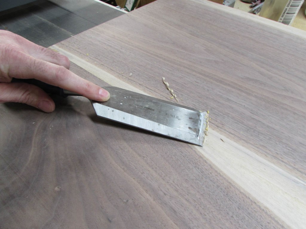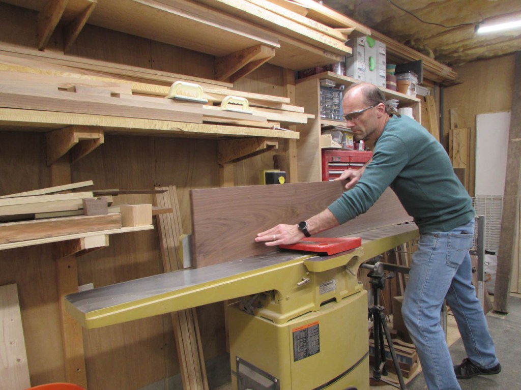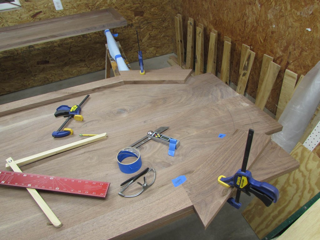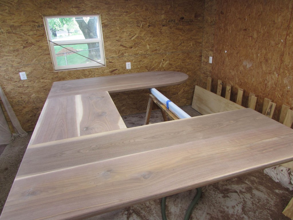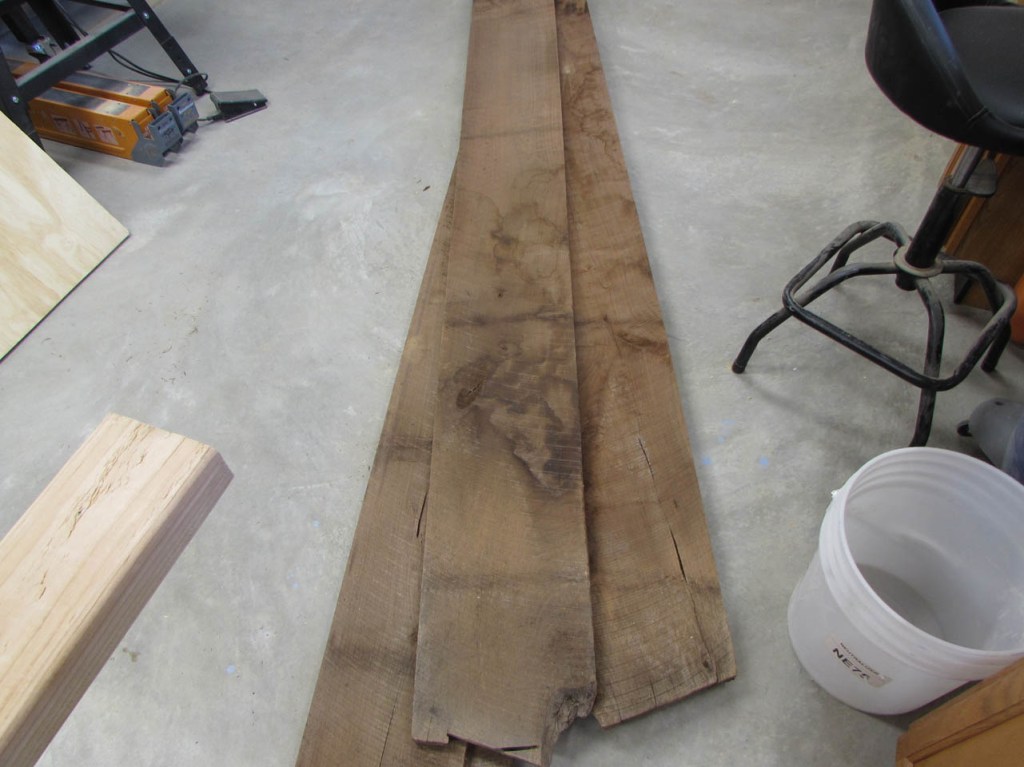 I thought about making the desk out of cherry to match the walls, but I get morning sun through the window on the left and cherry will get darker in the sun. Whatever I have on the desk will leave tan lines. I don’t have access to a lot of maple (to match the floor) and I don’t think it would look right blending in with the floor anyway. So, I decided on walnut for the desk top and shelves below to match the walls. I can get some beautiful air-dried walnut from my buddy Dave and I recently discovered a fellow nearby who has a bandsaw mill and he has some cherry that has been air-drying for two years. I bought a few boards from him as well. My plan for the desk is a crude pencil sketch at present because I am going to work on the walnut top first. I will be making a U-shaped desk that will be approximately 7′ long and about 9-1/2′ wide. The left side and middle will be similar to the two folding tables in size and location, and on the right, I will have a large 3’x7′ peninsula with a half round end. Beneath the peninsula will be a 6′ long cherry shelf that will have V-grooved panels on the back to match the wall. The shelf will support the right side of the desk top. The left side will have a much smaller shelf supporting the end that is in the corner so it will mostly be out of sight. The other end of the left side will have some square legs of some sort. The middle section will be suspended between the two sides and maybe, eventually have a small shelf for wire management.