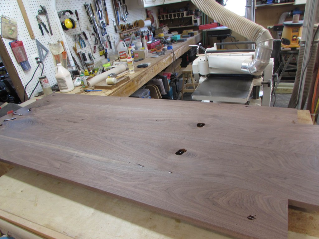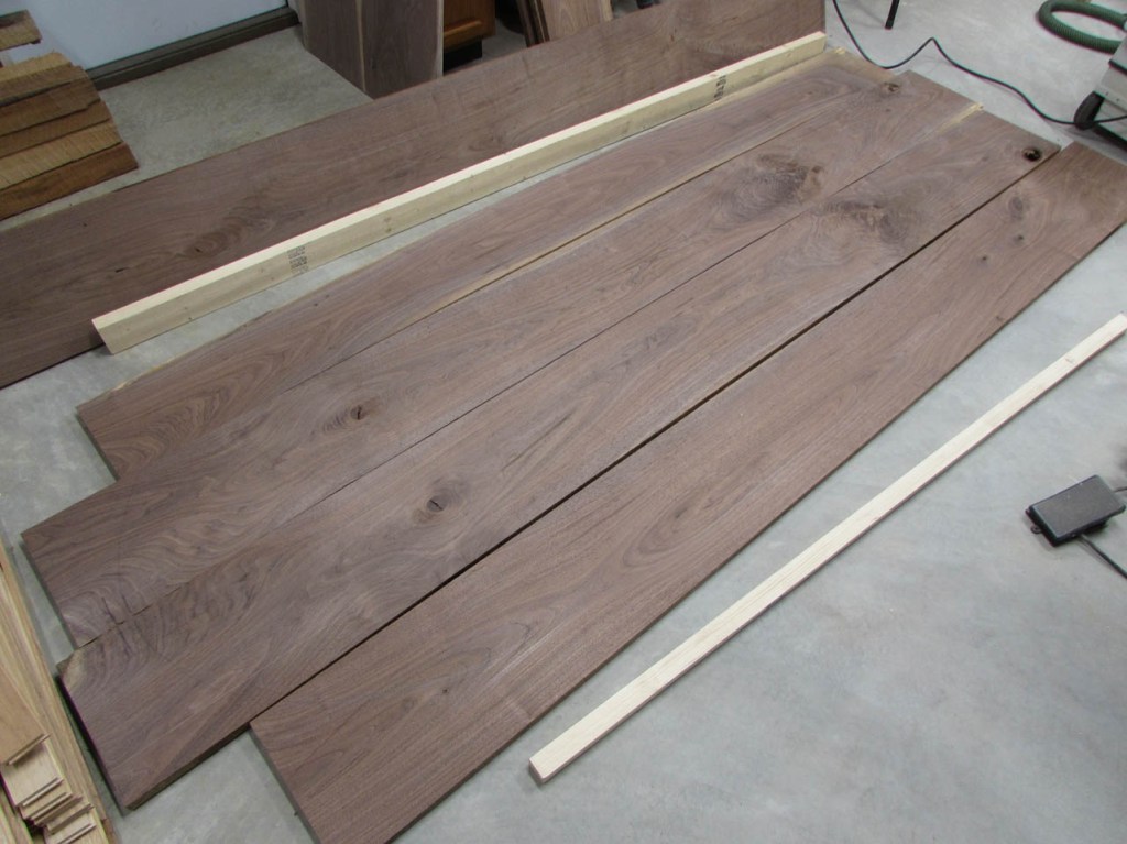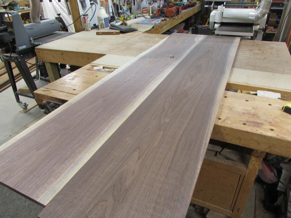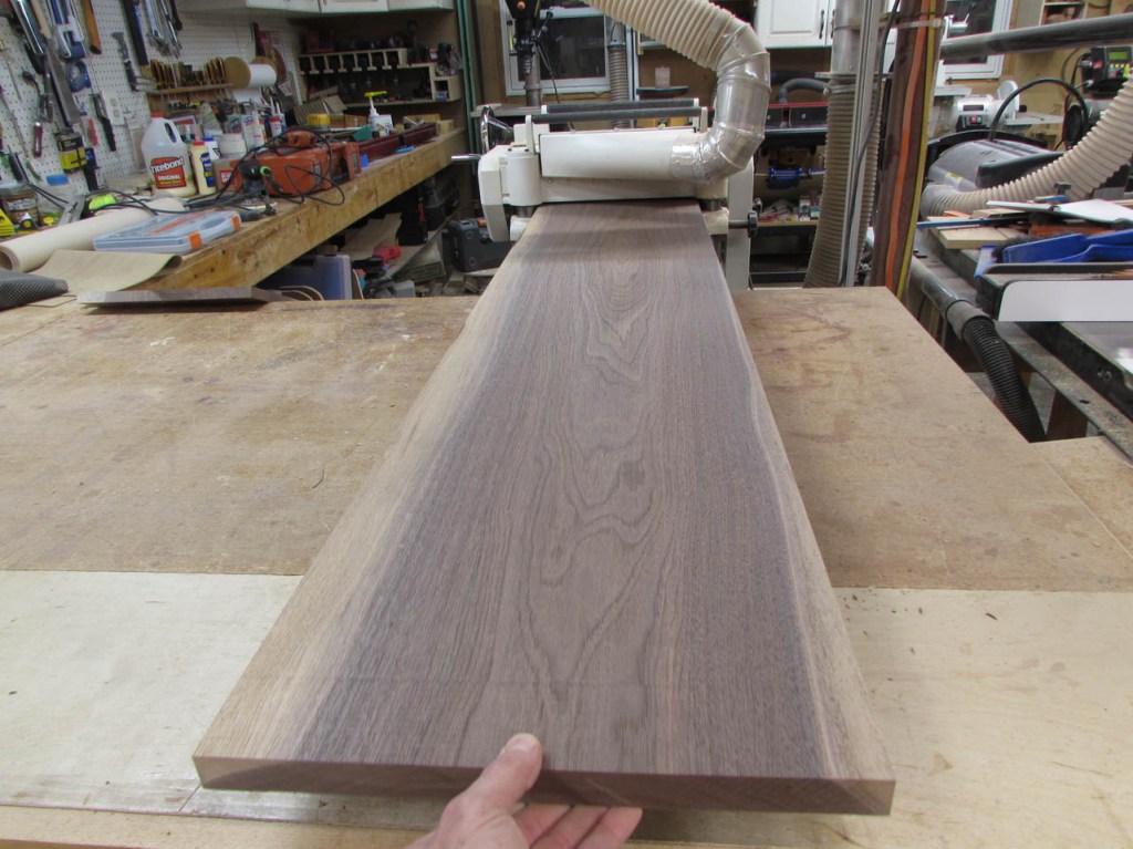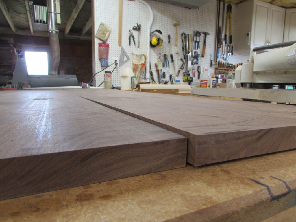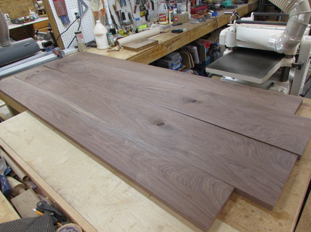 I drove out to my buddy Dave’s shop and acquired some 4/4 walnut boards that were between 11″ and 15″ wide. Dave gets some really nice big boards He needs the thicker 6/4 boards for another project so no live-edge slabs for this project…