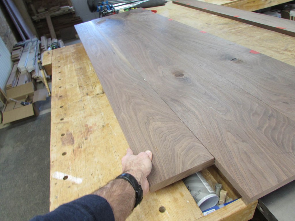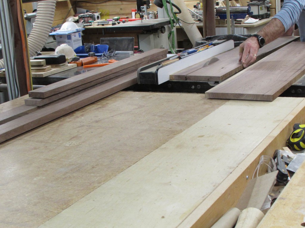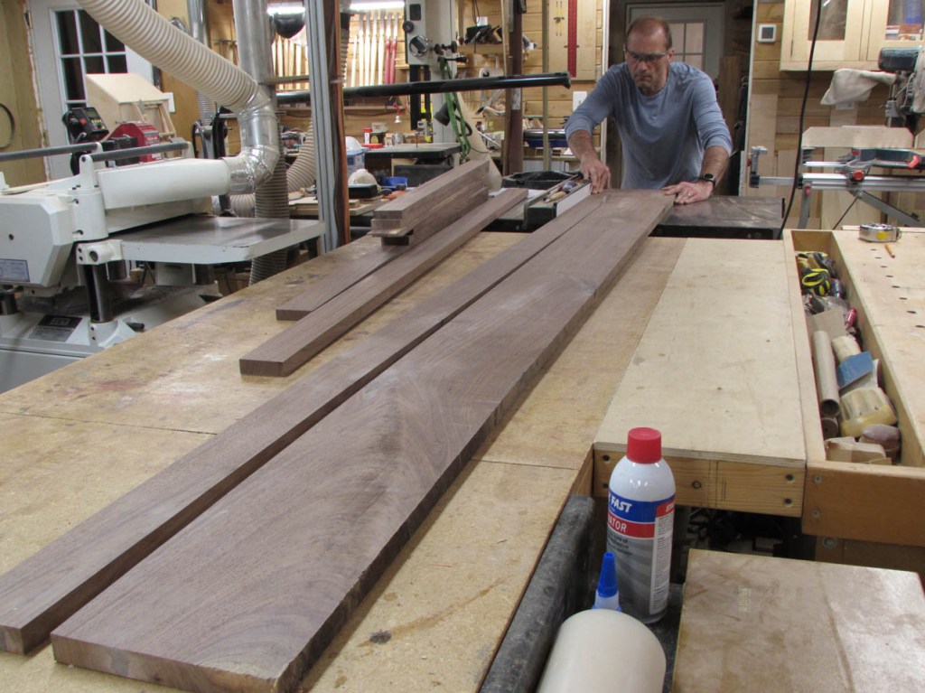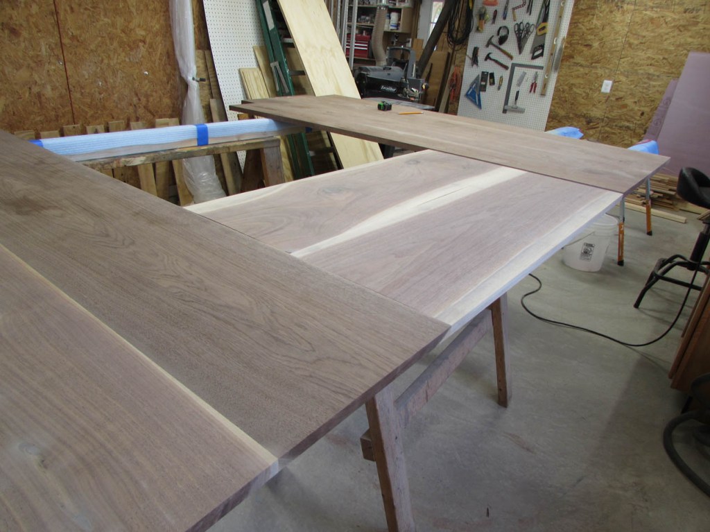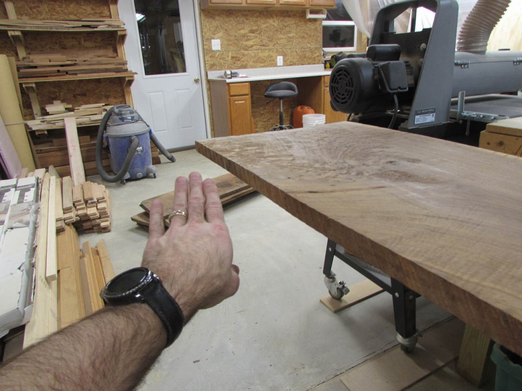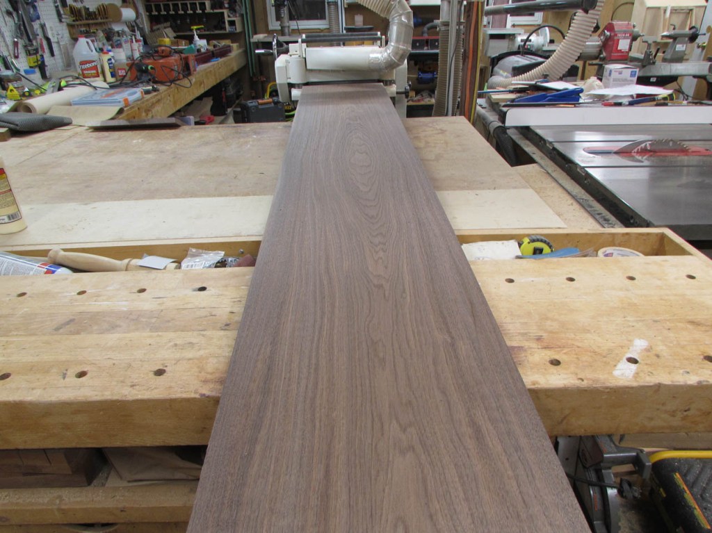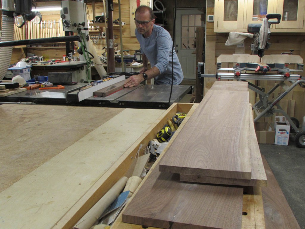 I drove out to my buddy Dave’s shop and acquired some 4/4 walnut boards that were between 11″ and 15″ wide. Dave gets some really nice big boards He needs the thicker 6/4 boards for another project so no live-edge slabs for this project…