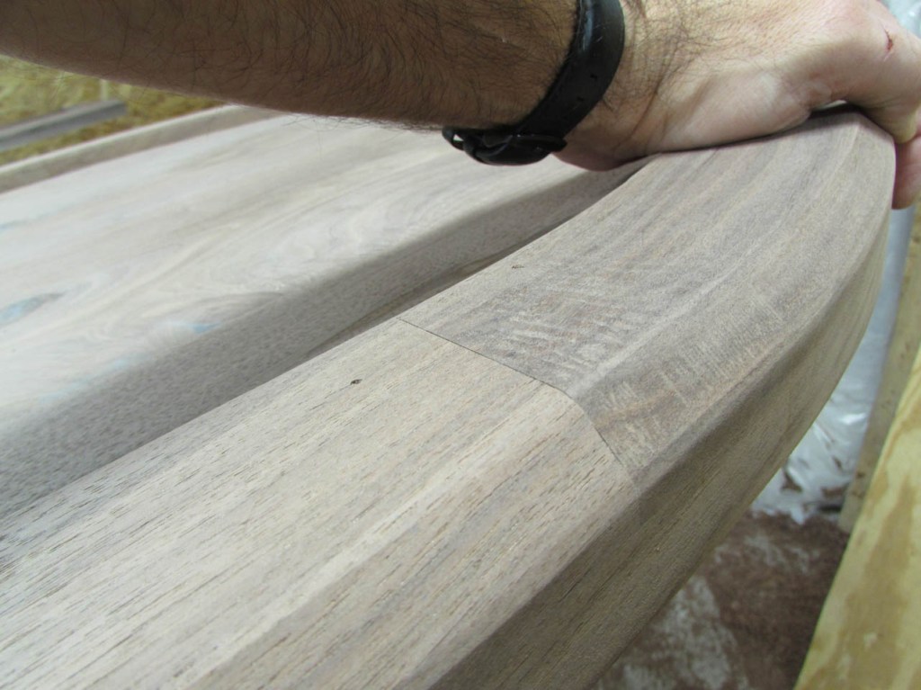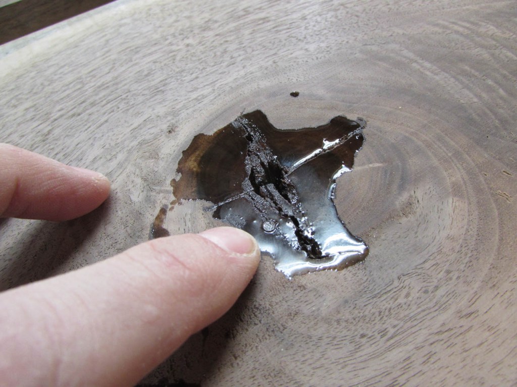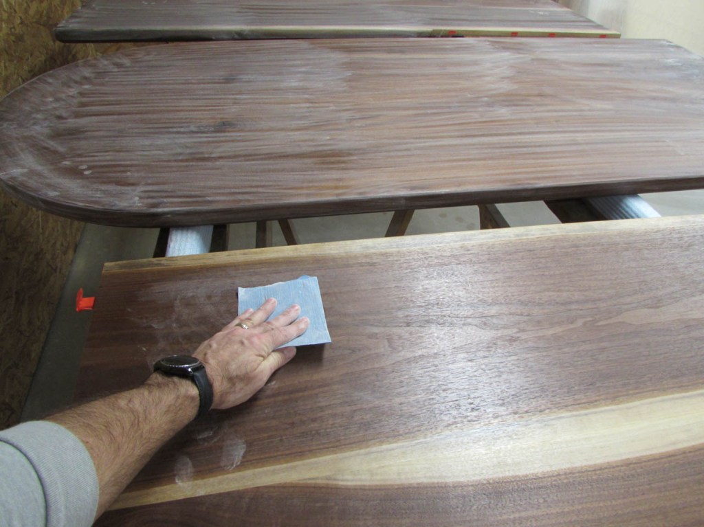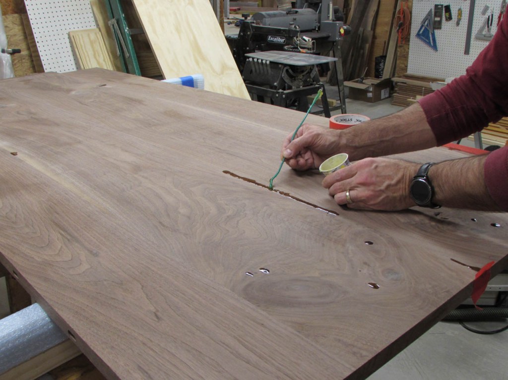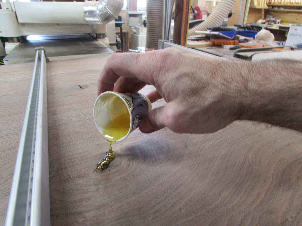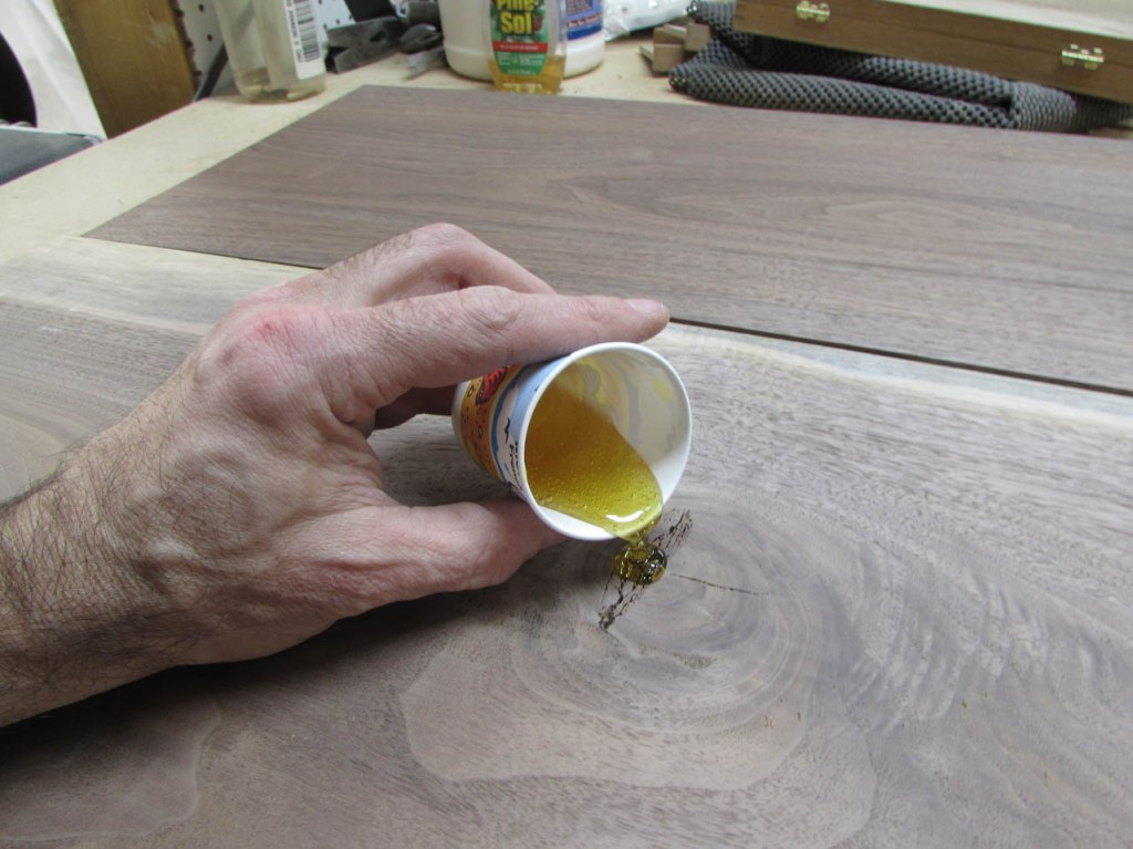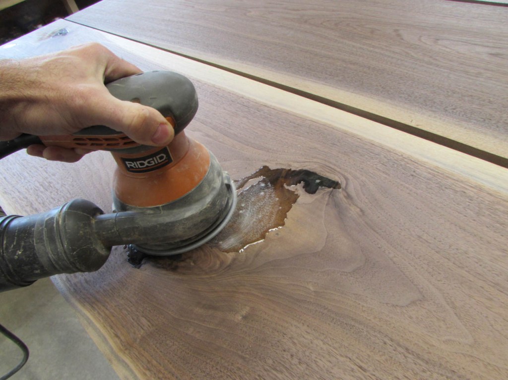 It takes a while to get all of the knots and cracks filled. I usually sand the excess down with 100 grit paper initially then add a bit more epoxy to fill any air bubbles. Eventually I will sand the surfaces down to 320 grit so the scratches will not be noticeable when finish is applied.