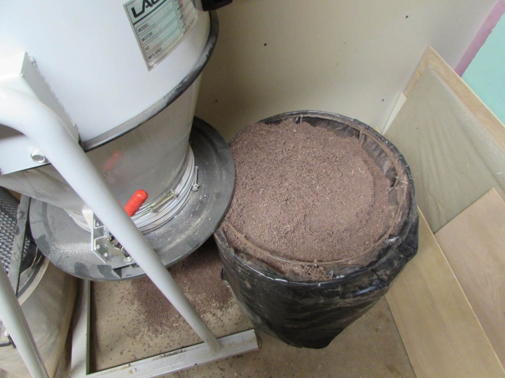 When it dries, I often have to come back a second or even a third time to fill them all the way up. While the first batch is curing, I finally noticed that all of my planing filled my dust collector again. I think I managed to fill four 30-gallon bags with sawdust, just planing down the walnut for this desk. Luckily my wife wanted to plant garden boxes this year and all of the sawdust got mixed in with the dirt for the boxes where it can break down into the soil.