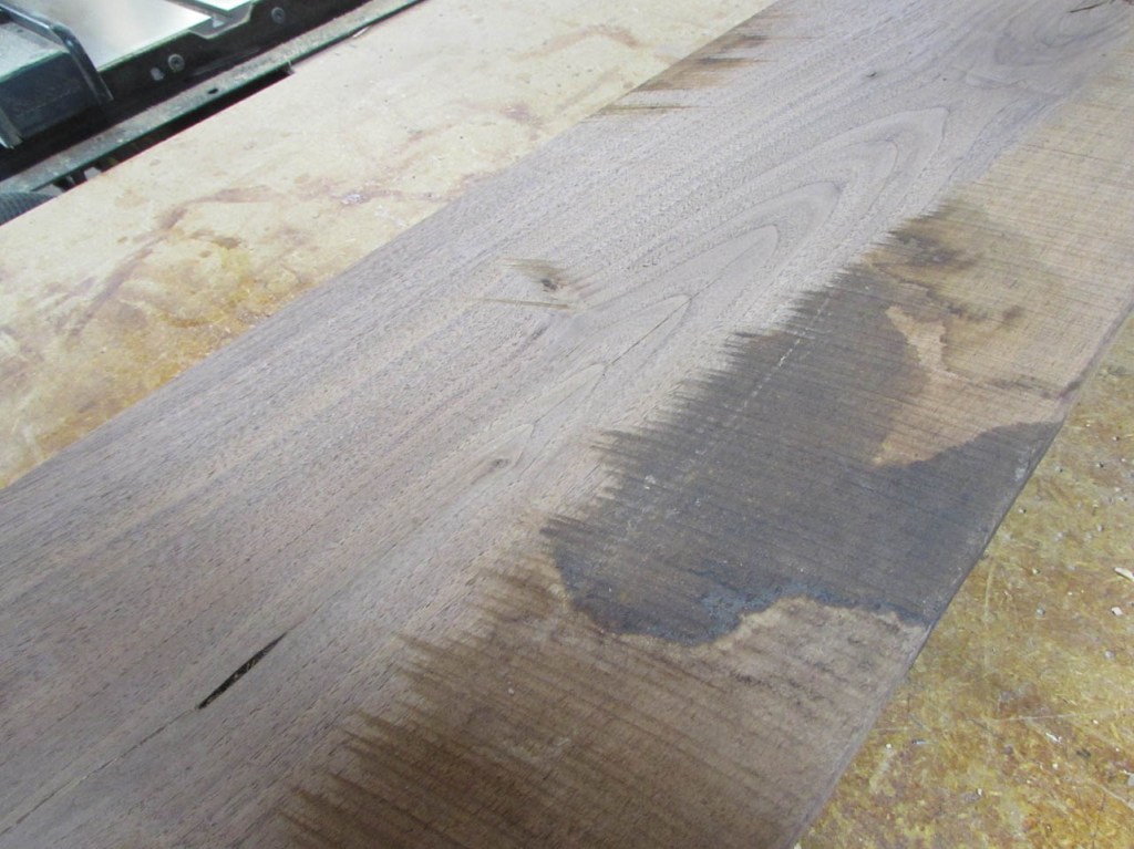 The building where these were stored will occasionally get some water in on the boards as they are drying. The water stains them but is is only on the surface. When they are planed, all the staining is removed.