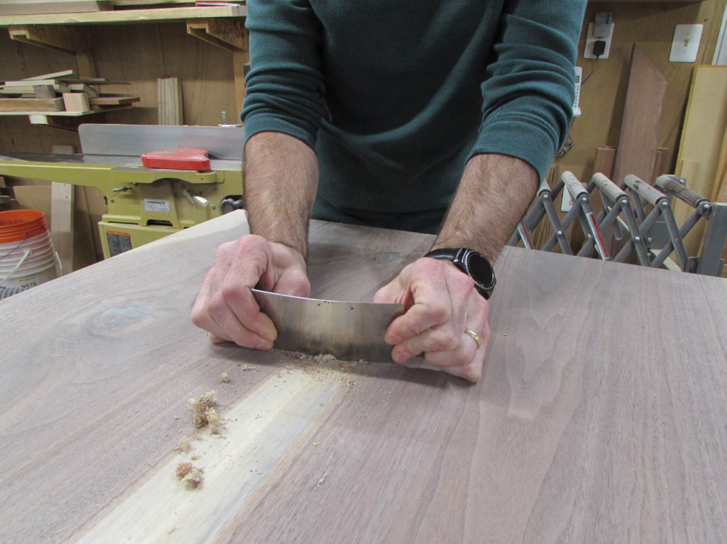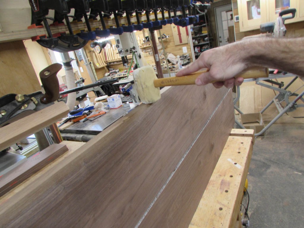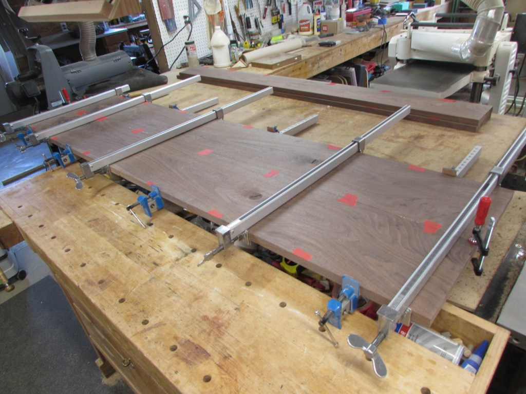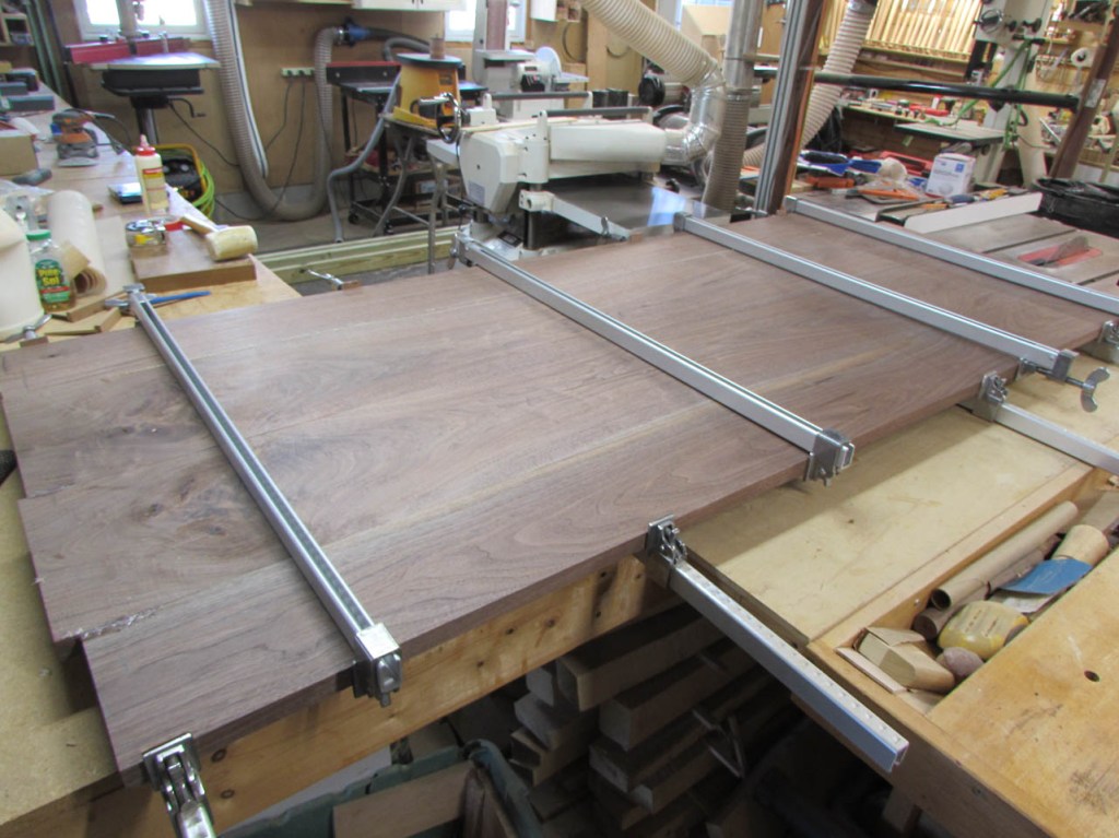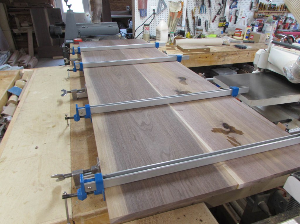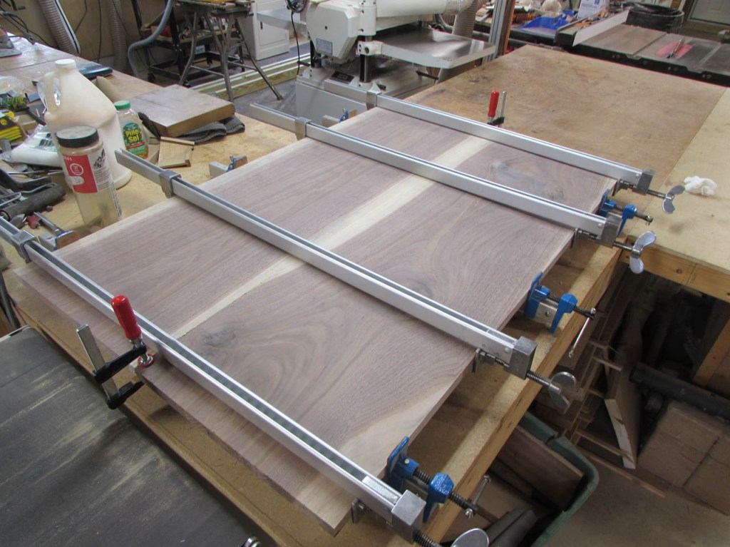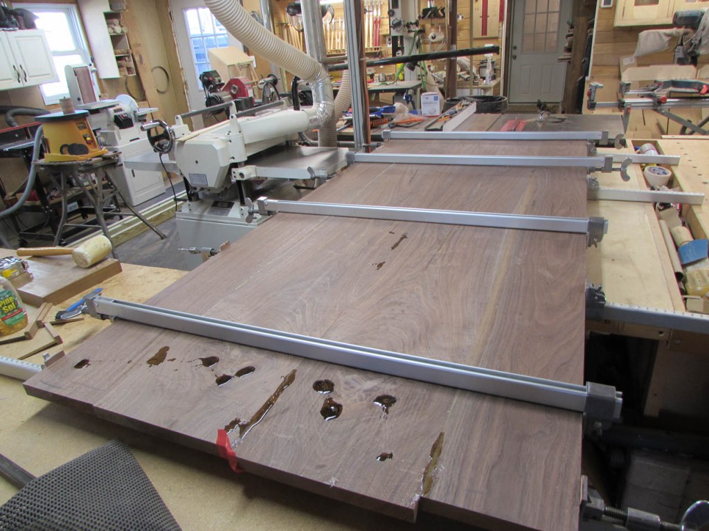 I cannot fit the finished panels through my planer but I took my time clamping them together so the surfaces are fairly well aligned. A little scraping and sanding and the panels are smooth enough for a desk.