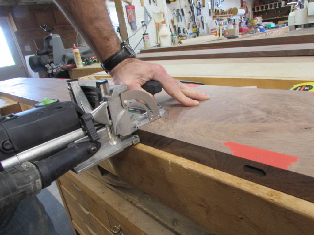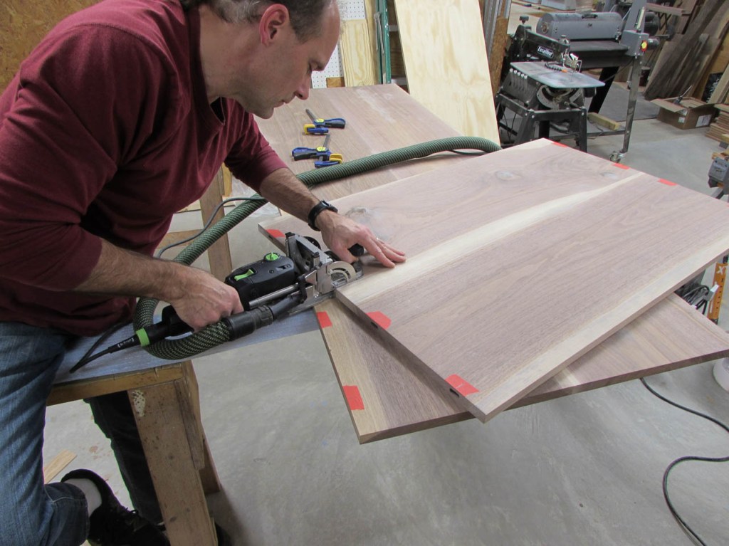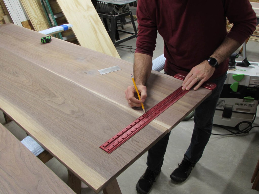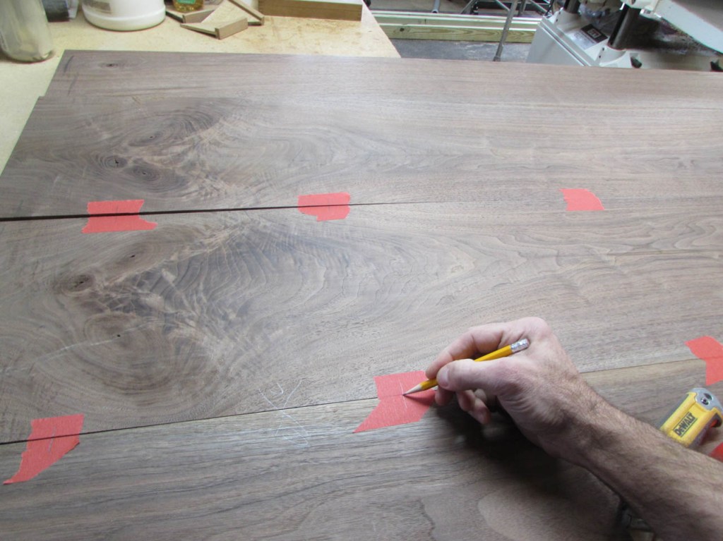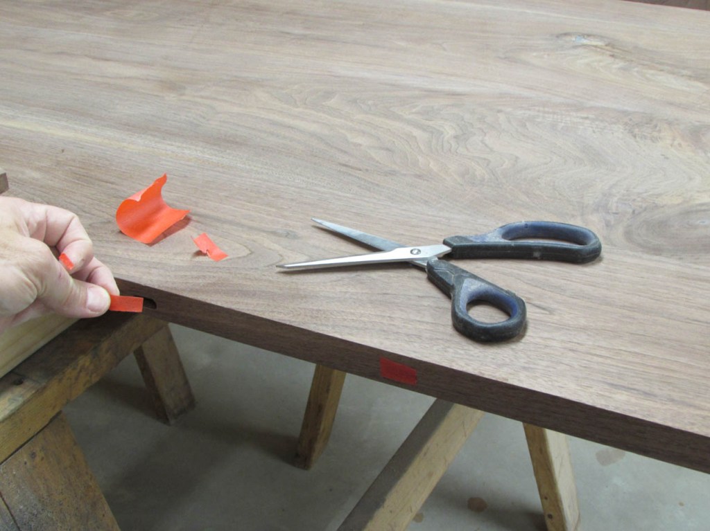 To align the boards better, I will be using some fairly big loose tenons. To mark the tenon locations, I use painter’s tape instead of marking the walnut. The pencil marks are far more visible on the tape.