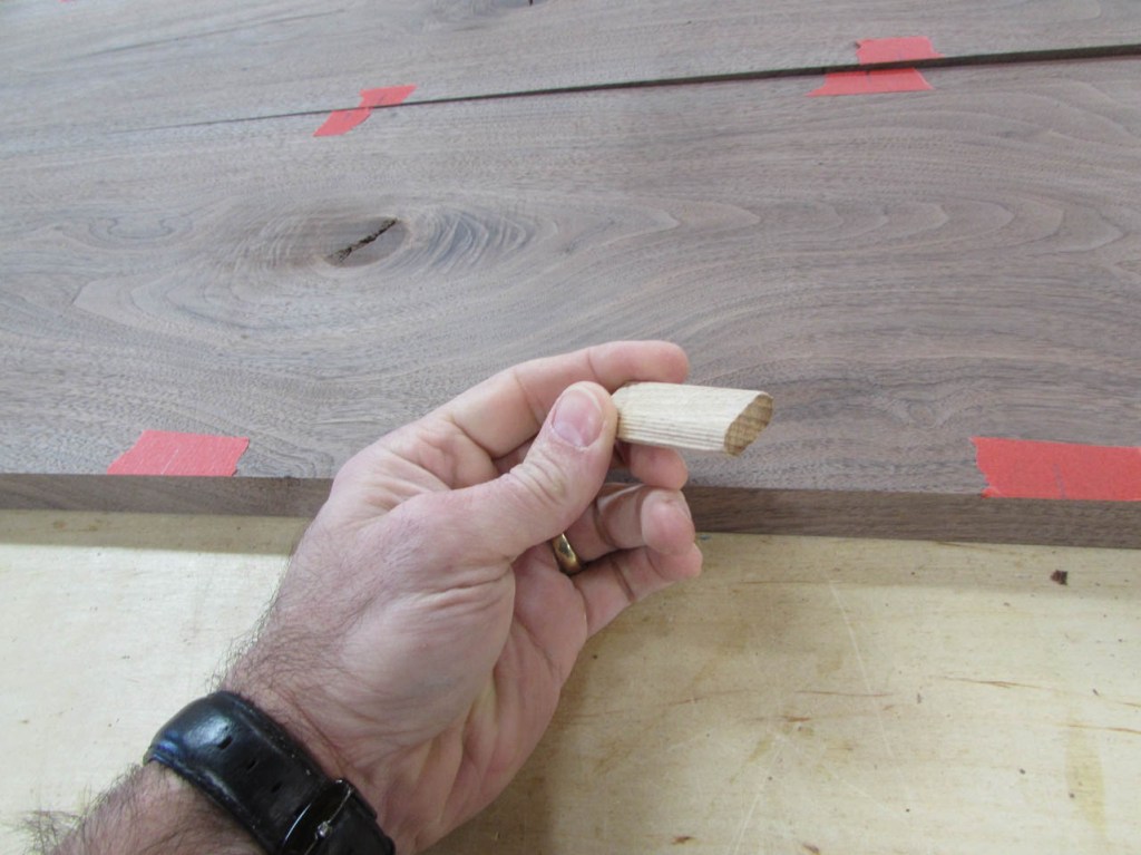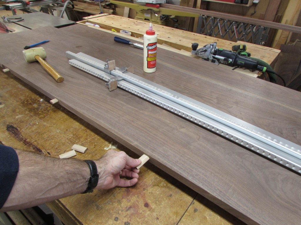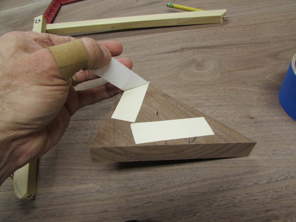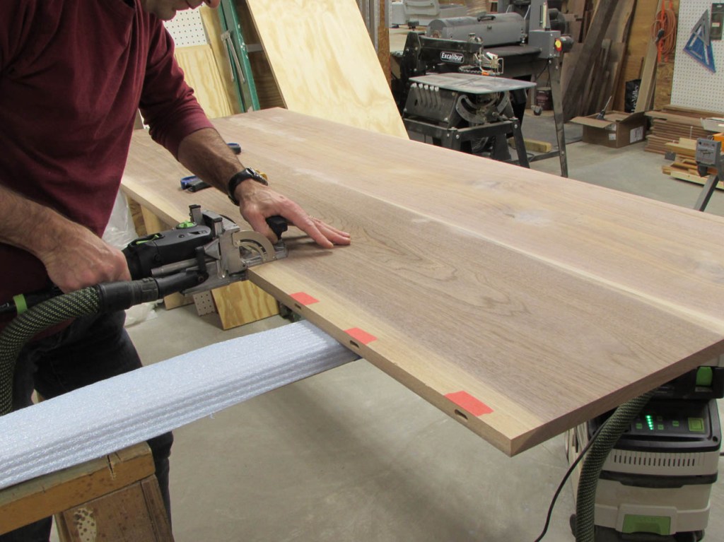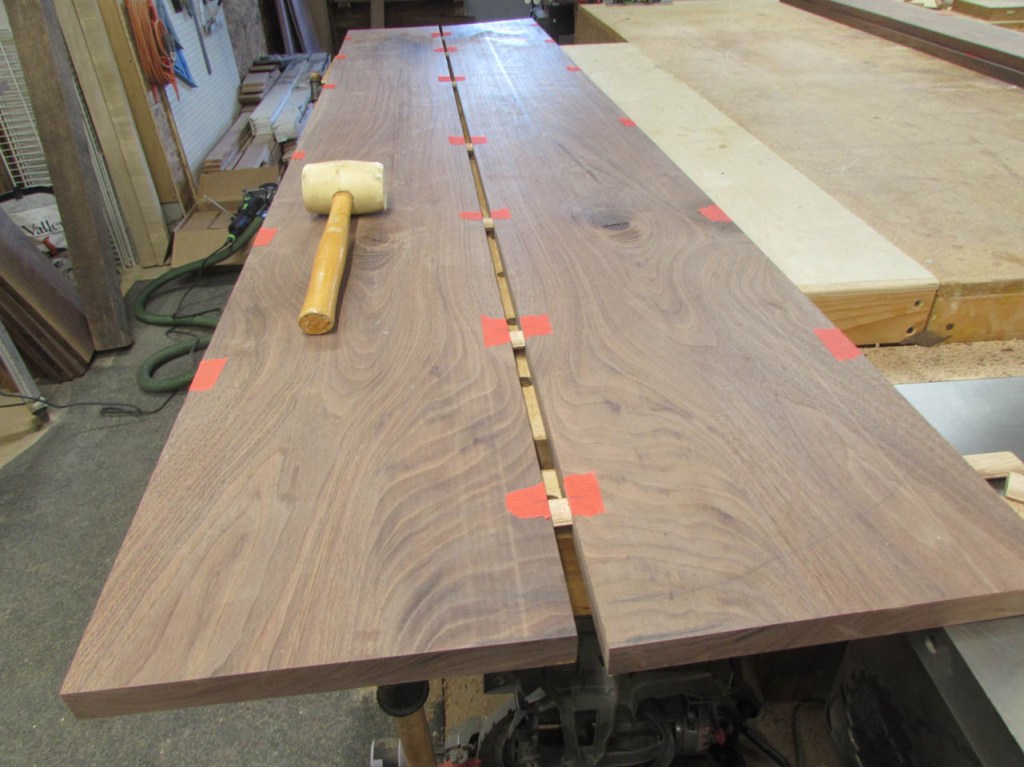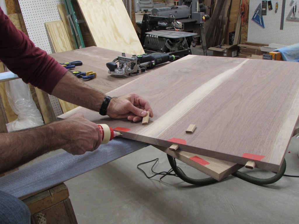 To align the boards better, I will be using some fairly big loose tenons. To mark the tenon locations, I use painter’s tape instead of marking the walnut. The pencil marks are far more visible on the tape.
