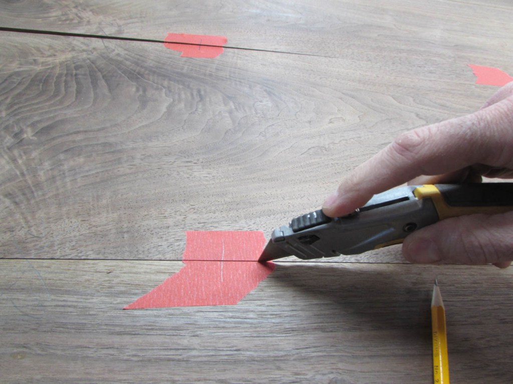 I use a utility knife to slice the tape so I can move the boards apart to cut the mortises.