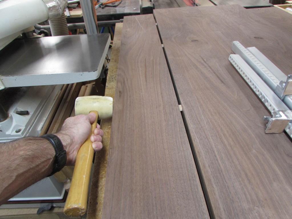 A little gentle persuasion is required but the boards draw together nicely. The Dominos keep the surfaces aligned but I put a clamp at the end of the glue joint on each end anyway.