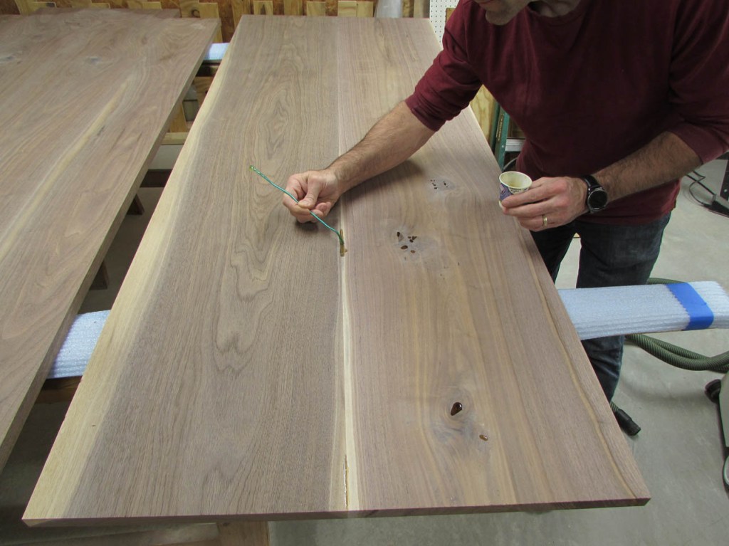 I had several boards left-over that had veining and cracks in the middle. I epoxied those spots as well but I plan on cutting them into 3″ wide strips to double up the outer edges of the desk.