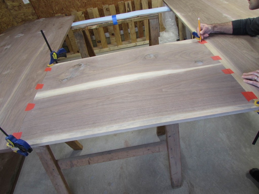 The peninsula will be the largest and most visible section of the desk. The other two sections will be covered with monitors and keyboards. I want the best looking wood to go into the peninsula. I have some really cool knots and curl at both ends so I align the boards in a way that shows them off the best. I was in luck because the two center boards are actually book-matched. The two outer boards are from the same tree so their color and grain matches fairly well too.