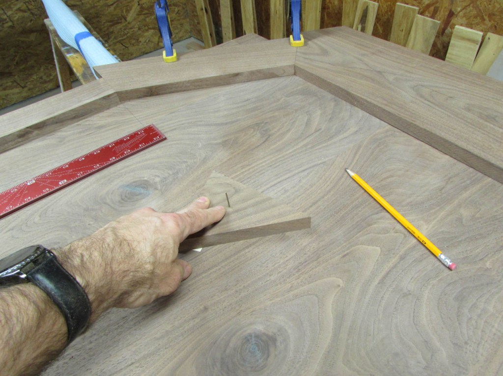 After cutting the first two angled pieces and clamping them down, I traced the angle onto the end piece to cut on the miter saw.