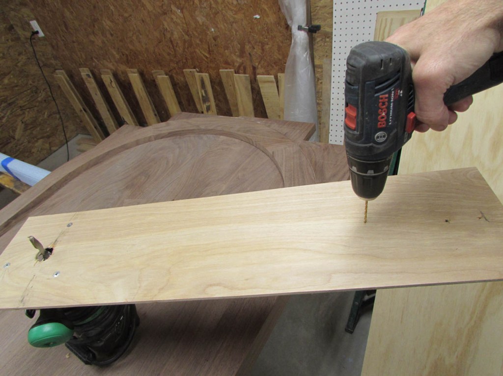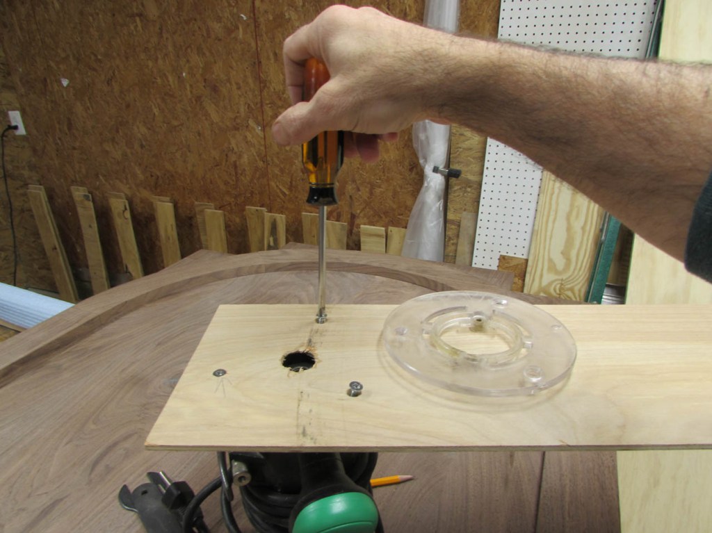To cut the radius through both layers, I am going to use another homemade compass. It is just a piece of 1/4″ plywood with a hole pattern for mounting my router. I drilled a hole at the pivot point to attach with a screw to my center block.