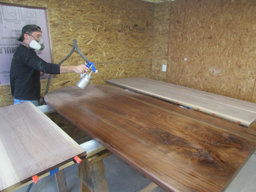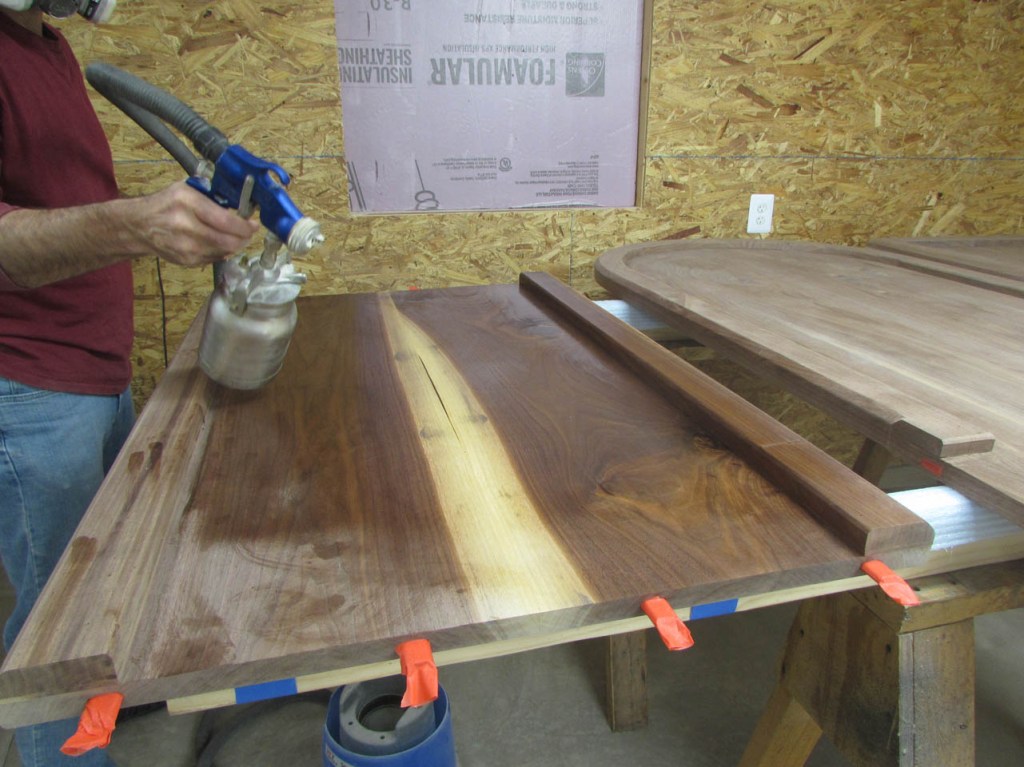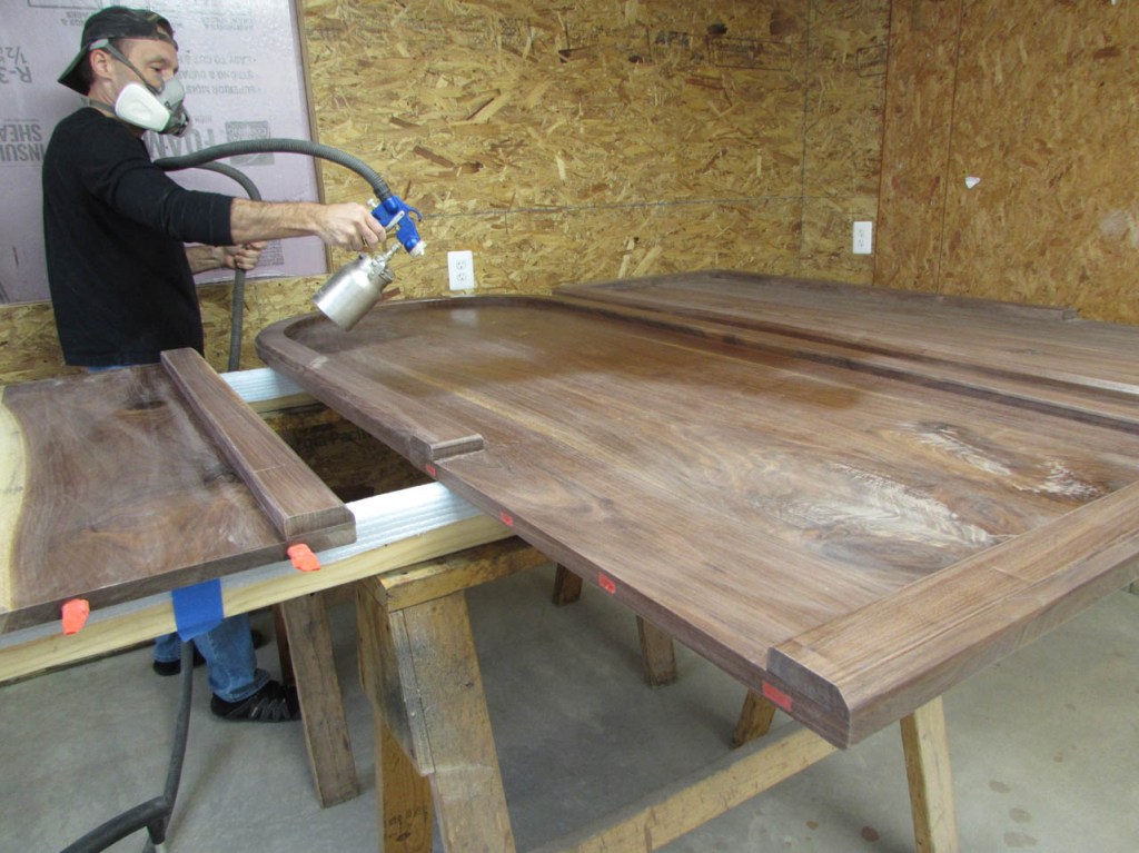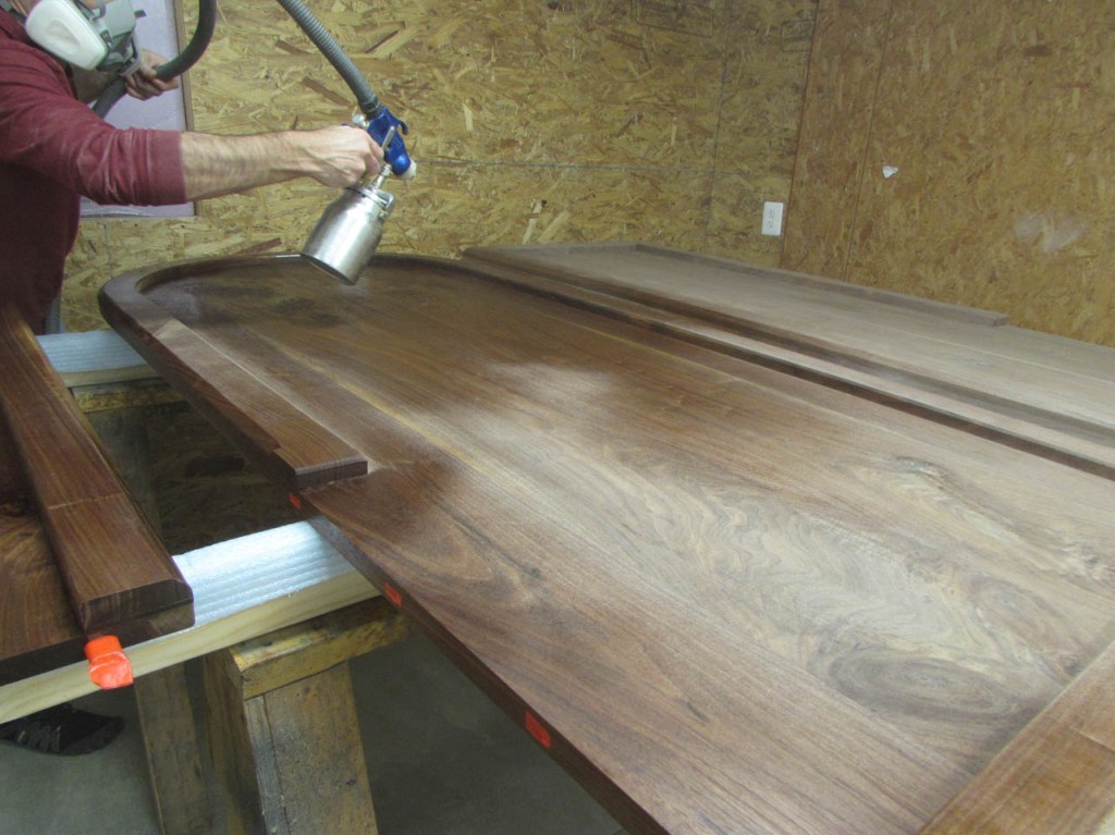 I loaded a pint of oil-based satin polyurethane into the HVLP spray gun and started spraying. Glad I started on the bottom because the sprayer started leaking when under pressure. The gasket between the sprayer and the can has gone bad after about 10 years, so I had to order a new one. $4 shipping for a $2 part. I ordered four of them so this won’t be a problem again. For the moment though, I cut some thick duct tape into strips and wrapped the top of the can and clamped it all beck together. It works, but I am not taking it apart until I am done spraying…