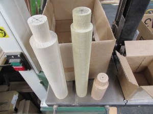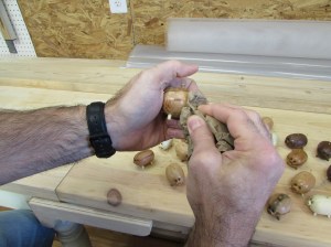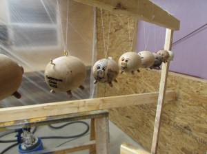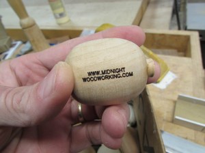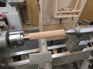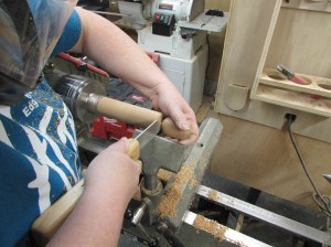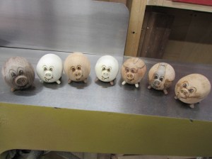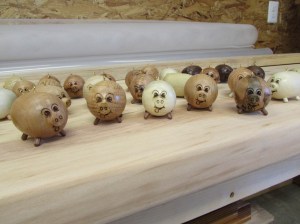 The first step was to figure out the best method of work holding for pieces in the lathe. I grabbed several different species of wood to play with, holly, ambrosia maple, oak, black cherry, poplar, soft maple, and mahogany. After making the stock round and stepping down one end, we fit them in a chuck and my wife started cranking out pigs.