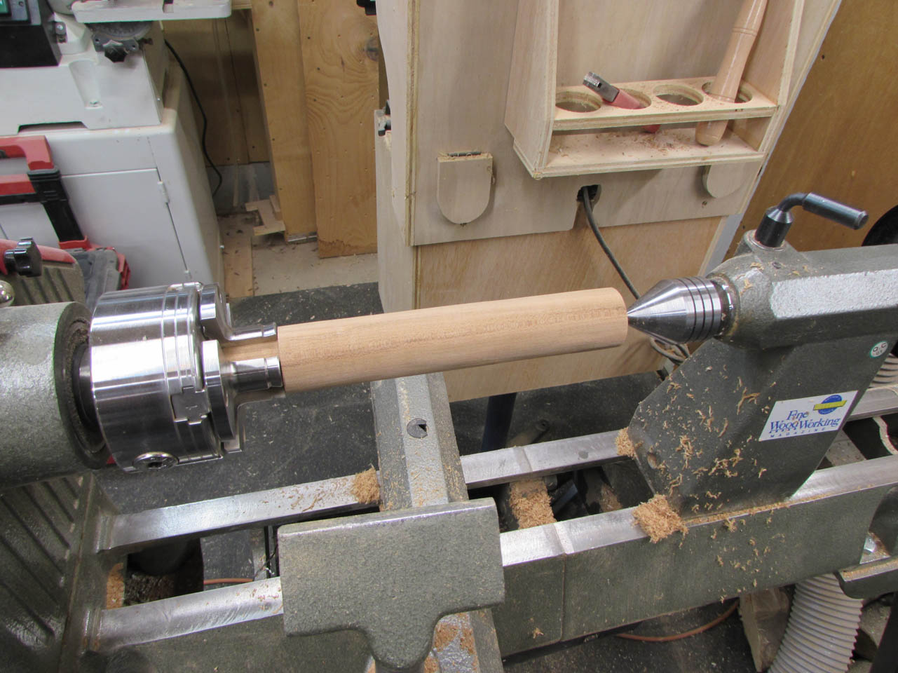 She left the tail stock in place through the heavy turning, then removed it to part off the end.