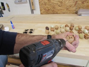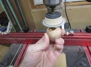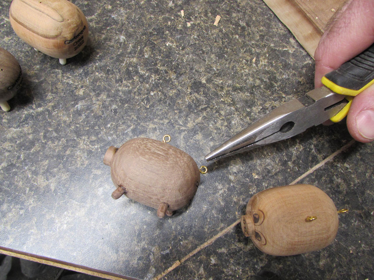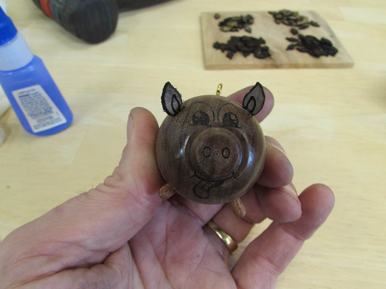 Initially the eyes and nose holes were small holes followed up with black magic marker. The ears were cut from some scrap leather and the legs were also turned on the lathe, then rounded, sanded, then cut. He was cute, but took about an hour to make.