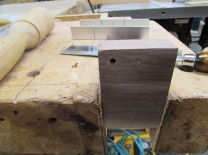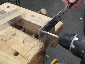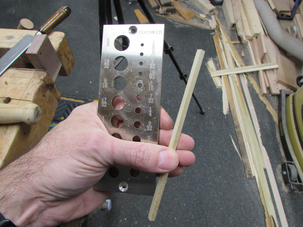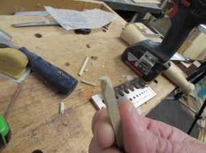 I want a 3/16″ diameter dowel so you start by cutting a square 3/16″ stick, then drive it through the hole in the plate, I sharpened the tip to start it.