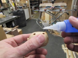 To add the legs, I drilled some 1/8″ deep holes with a 3/16″ drill bit, then placed a drop of CA glue in each hole.