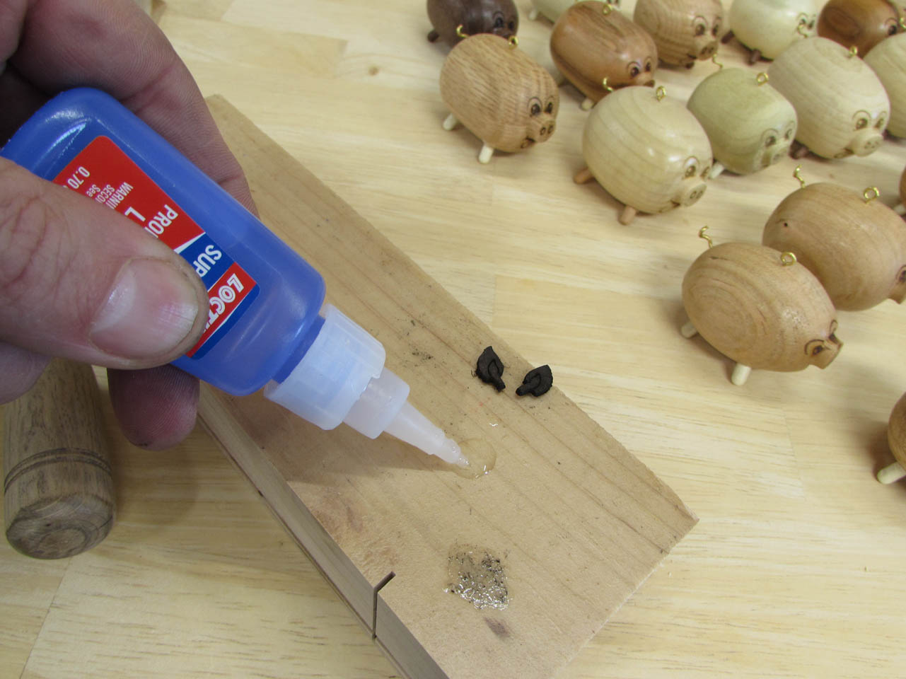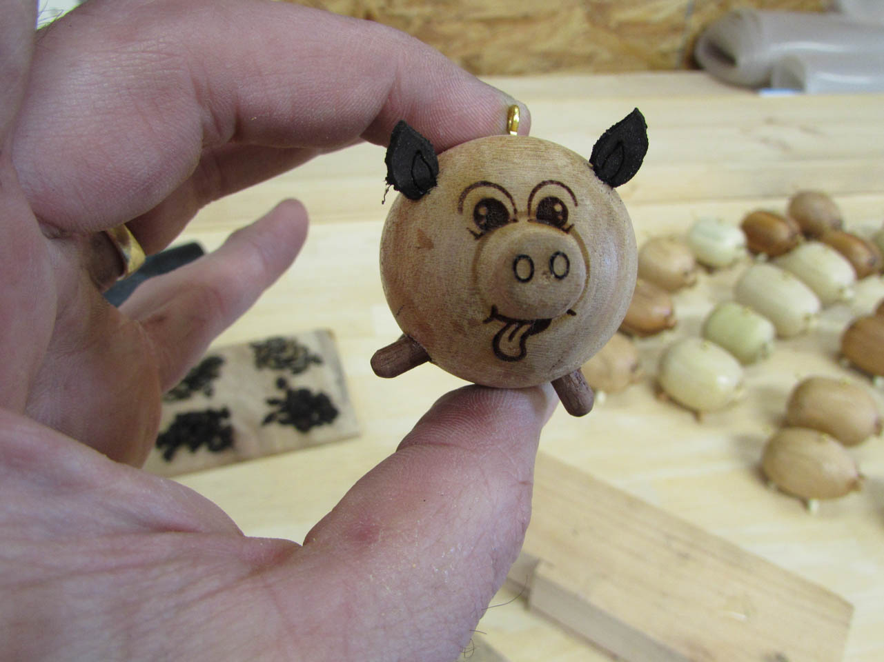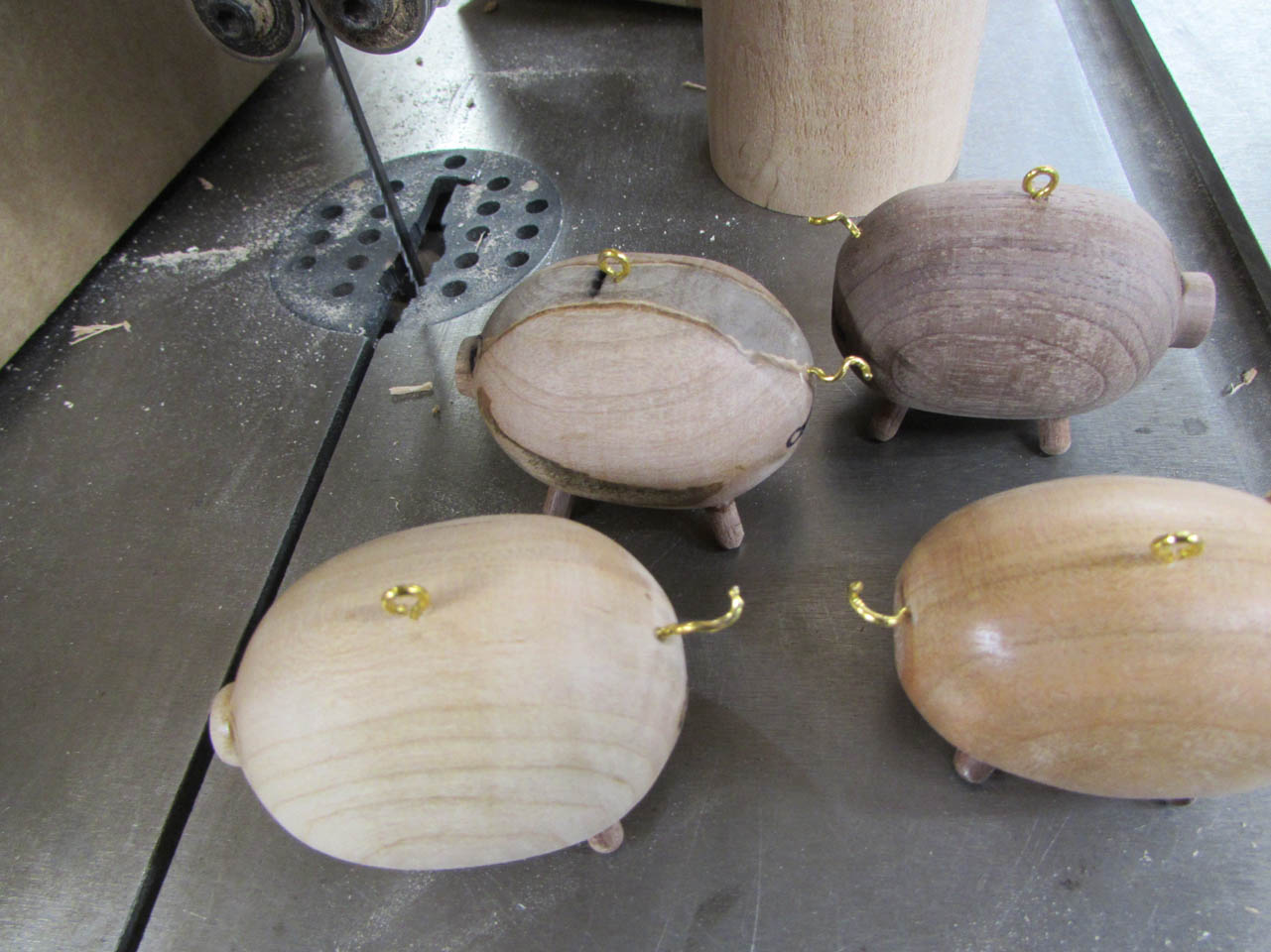 One down, 144 to go. I made little feet out of five different kinds of wood to mix and match with the colors of the pigs.