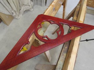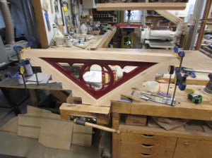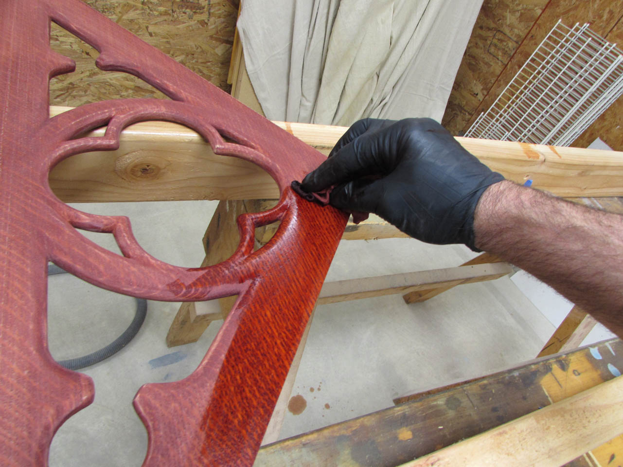 When the centerpiece is dry, I double-check the surface to see that it is still smooth, then spray on a couple of coats of water-based polyurethane to seal the surface. I used water-based because it will not change the color of the red dyed wood any further. I will be spraying an oil-based finish onto the rest of the wood that will frame this piece. The oil-based poly will soak into the grain of the rest of the wood, darkening it slightly and giving it a warmer tone. I want to prevent any of the oil from soaking into this piece. I will probably mask it off when I spray the rest, but this is added insurance against any oil infiltration.