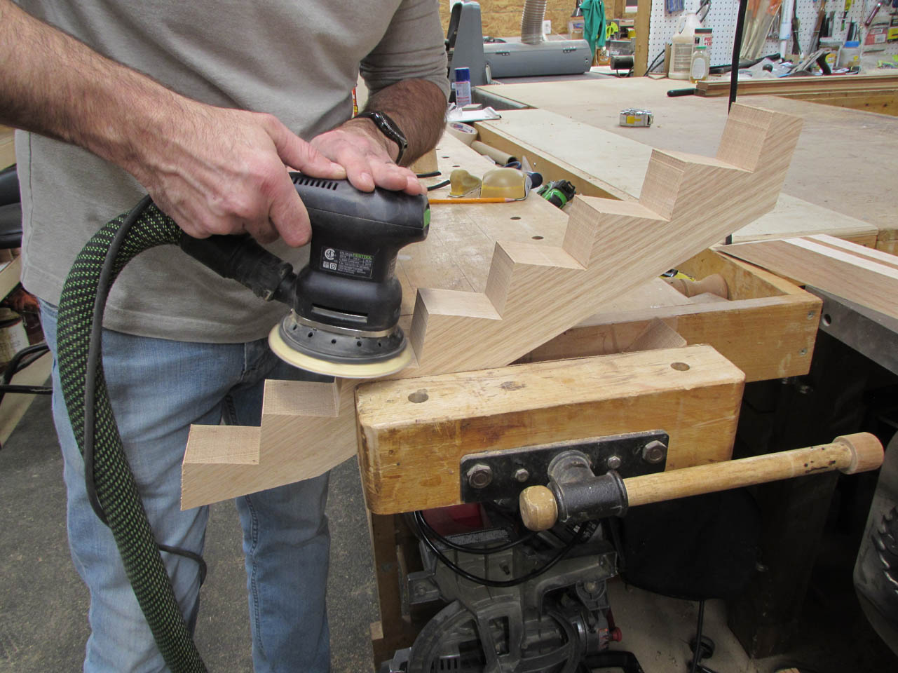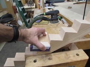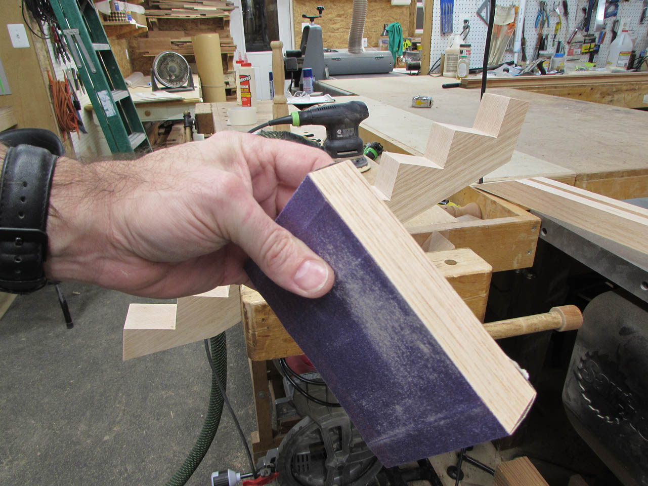 This gives me a solid, flat surface to finish sand with. The orbital has a cushion below the sand paper and if I press too hard, it can round over some of the edges. The sanding block leaves crisp, sharp edges and a perfectly flat surface. It just takes a little patience…