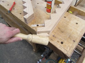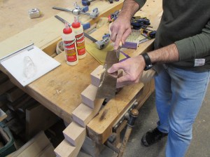 Next step is to attach the two sides of the head piece. I apply glue to the spline and beat it into place.