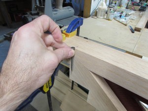 After the glue is dry enough to pull the clamps, I use my razor saw to remove the bit of spline that was sticking out, then sand the top flat.