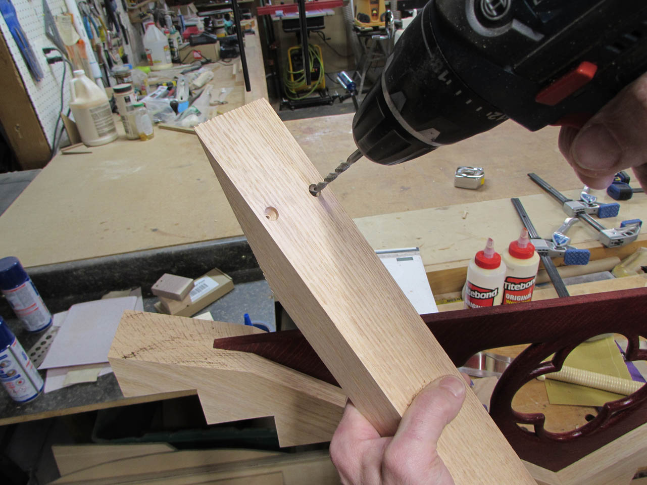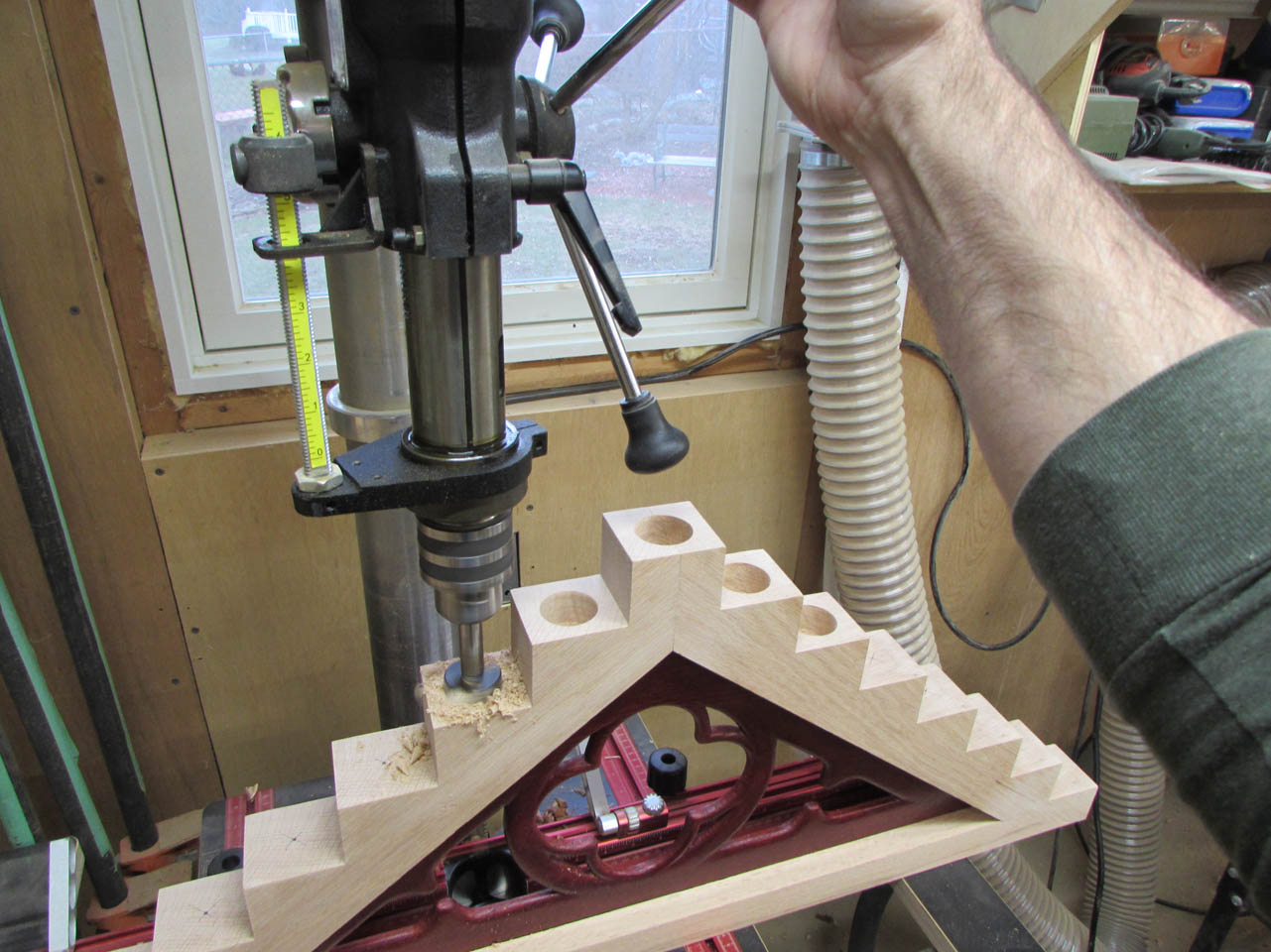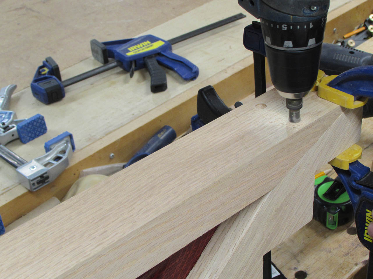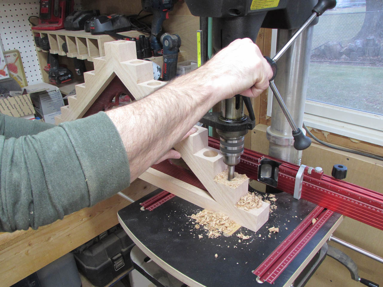 I keep the drill at a slow speed, 250 rpms, to reduce heat build-up. If the bit gets too hot, it will burn the wood and dull the bit.