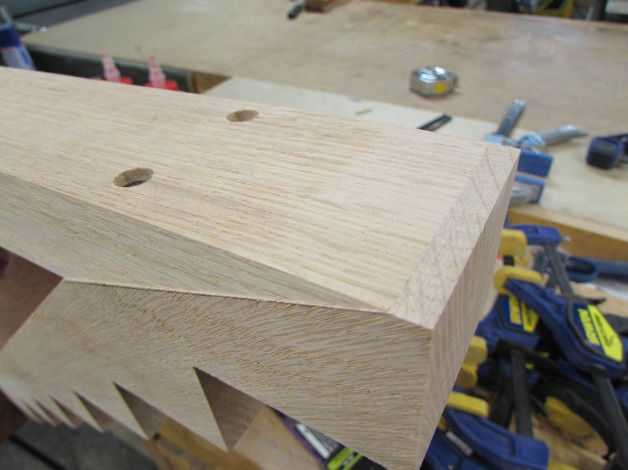 After the screws are tightly drawn down, you can see the ends of the top pieces hanging down. These can be trimmed flush easily on my sander.