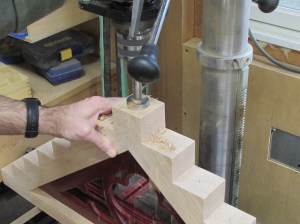 Time to drill the candle cups. I loaded a 1-1/2″ diameter forstner bit into the chuck and brought it down on my center mark.