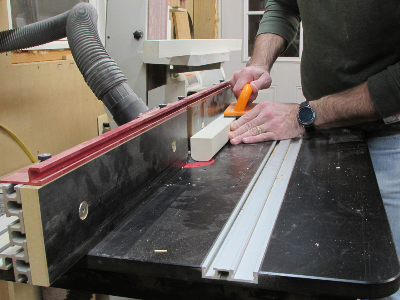 To create the 1/2″ quarter-round trim, I set a 1/2″ round-over bit in the router table and cut two edges on the board.