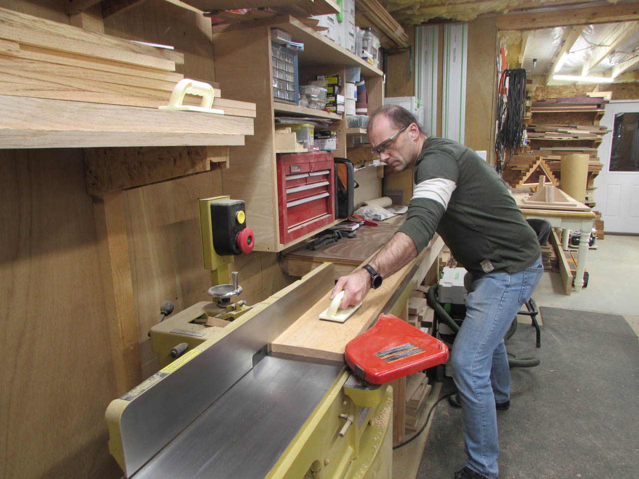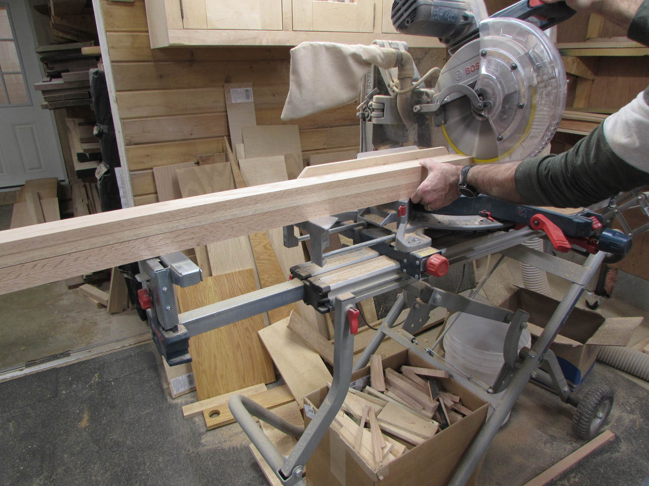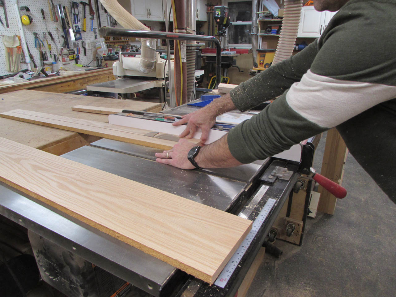 I start by jointing and planing down some boards to 3/4″ thick, then ripping them down to 2-1/2″ wide and cutting all four of them to 51-1/2″ long.