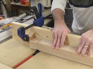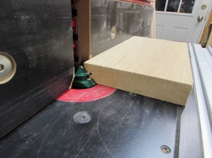I am going to use my cross-cut sled to make several cuts along each end, to take the ends down to the desired thickness. For the bottom, I set up a stop block, 6″ from the blade.