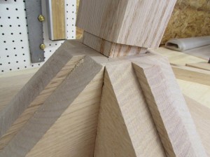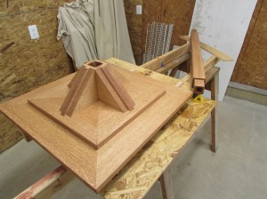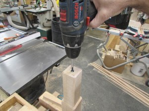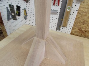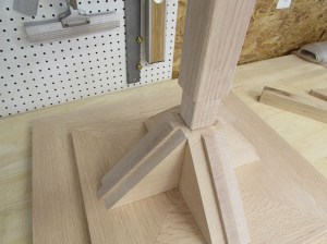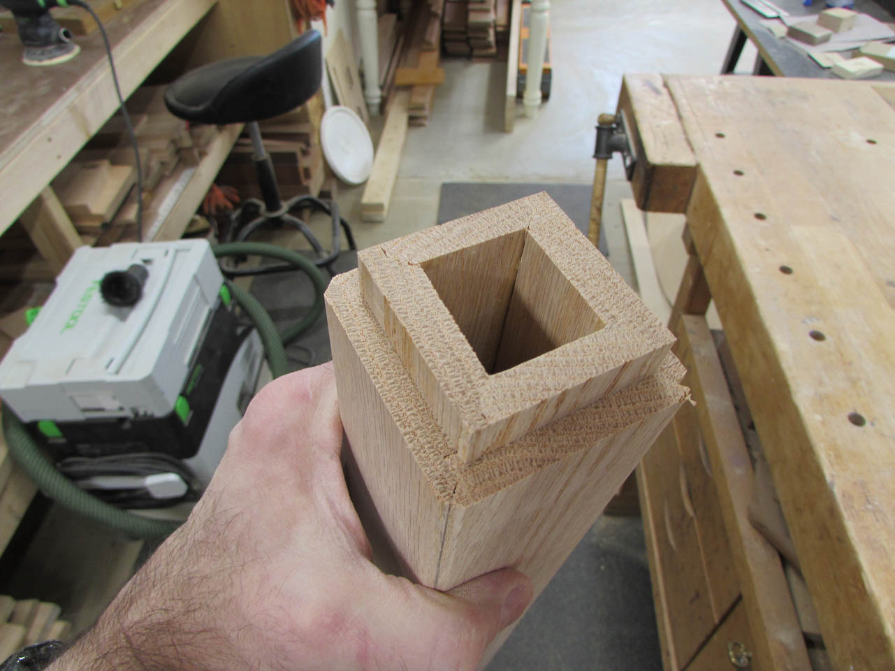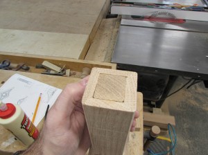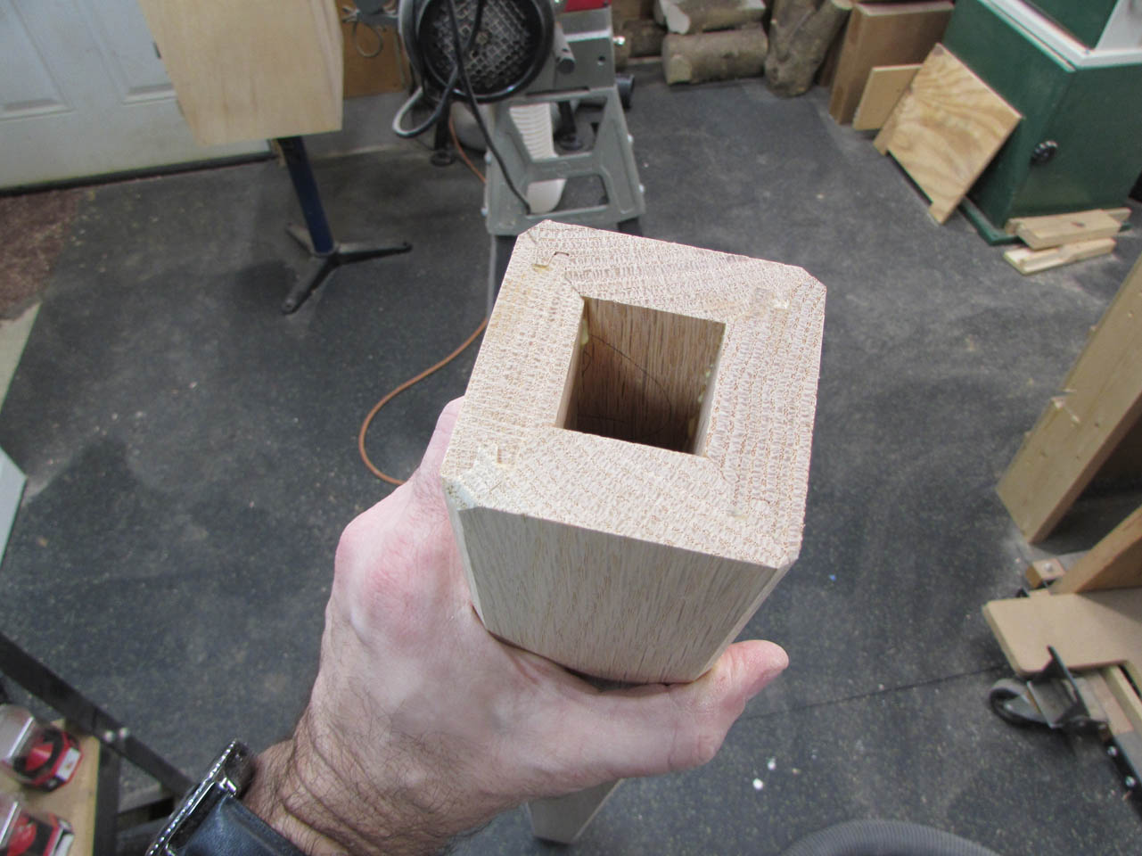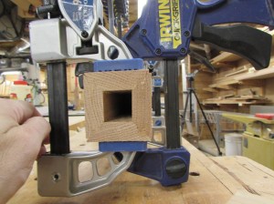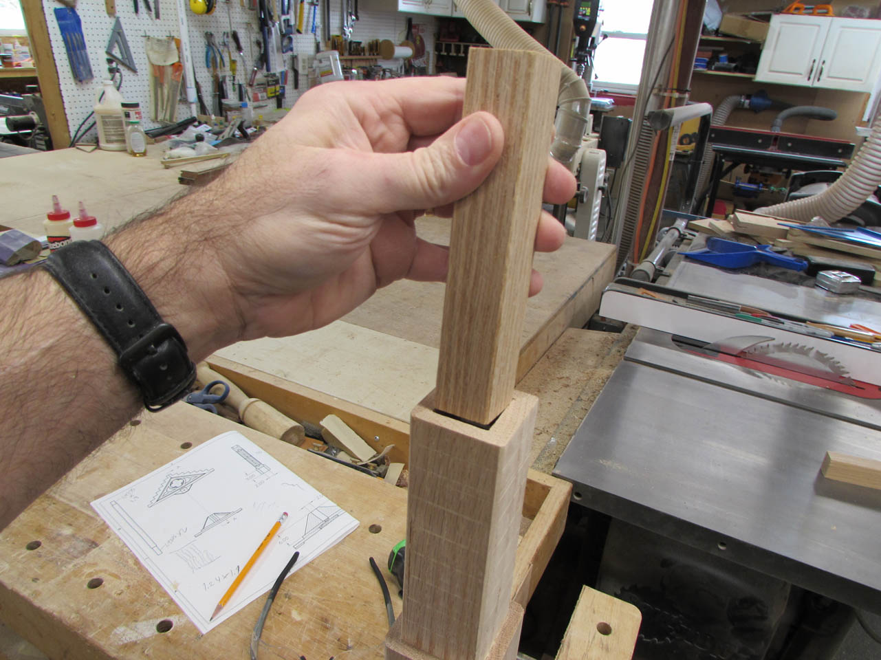The center post wouldn’t be too complicated if I were to make it from a solid piece of wood. Unfortunately, that would allow for too much wood movement. The thicker a piece of wood is, the more moisture it can hold in the center. The outside is prone to dry quicker than the center of the wood. That could cause swelling and cracking. The center post will fit fairly snugly into the sockets of the top and the base. Swelling can cause difficulty with fitting the pieces together.