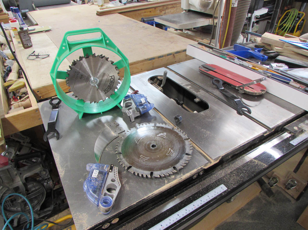 The dado blade is a stack of saw blades that equal 3/4″ wide. It is six times wider than my regular blade, speeding up this process considerably.