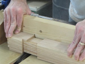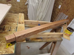 Currently the post is about 2-1/2″ wide and the holes in the head piece and the base are just under 2″ wide. I need to cut the ends down so that the post will fit in both.