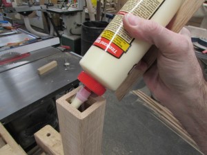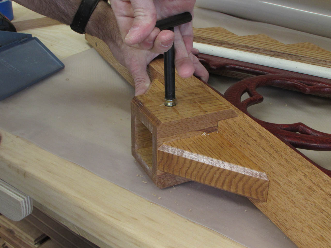 First, I need to glue in a solid block into the base of the post to receive the threaded insert. I cut the block to be a tight fit then add some glue and tap it into place.