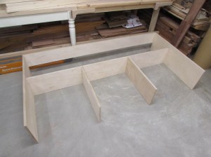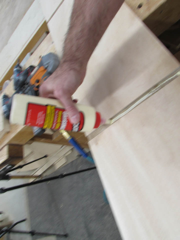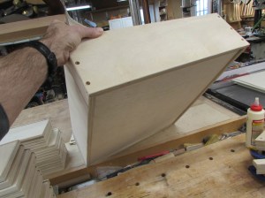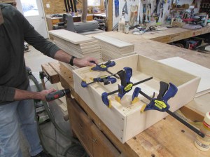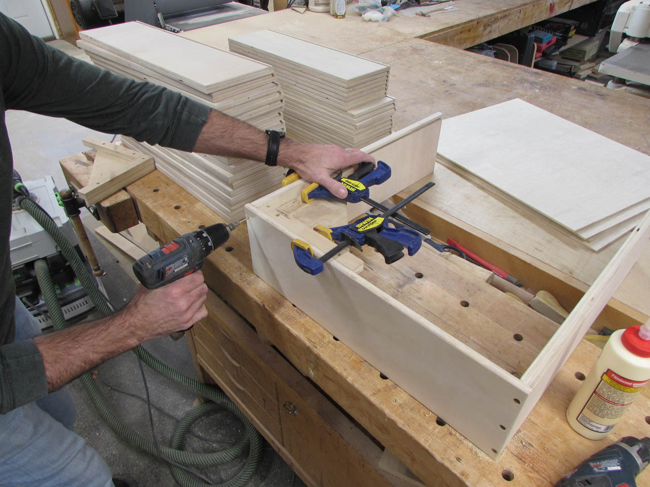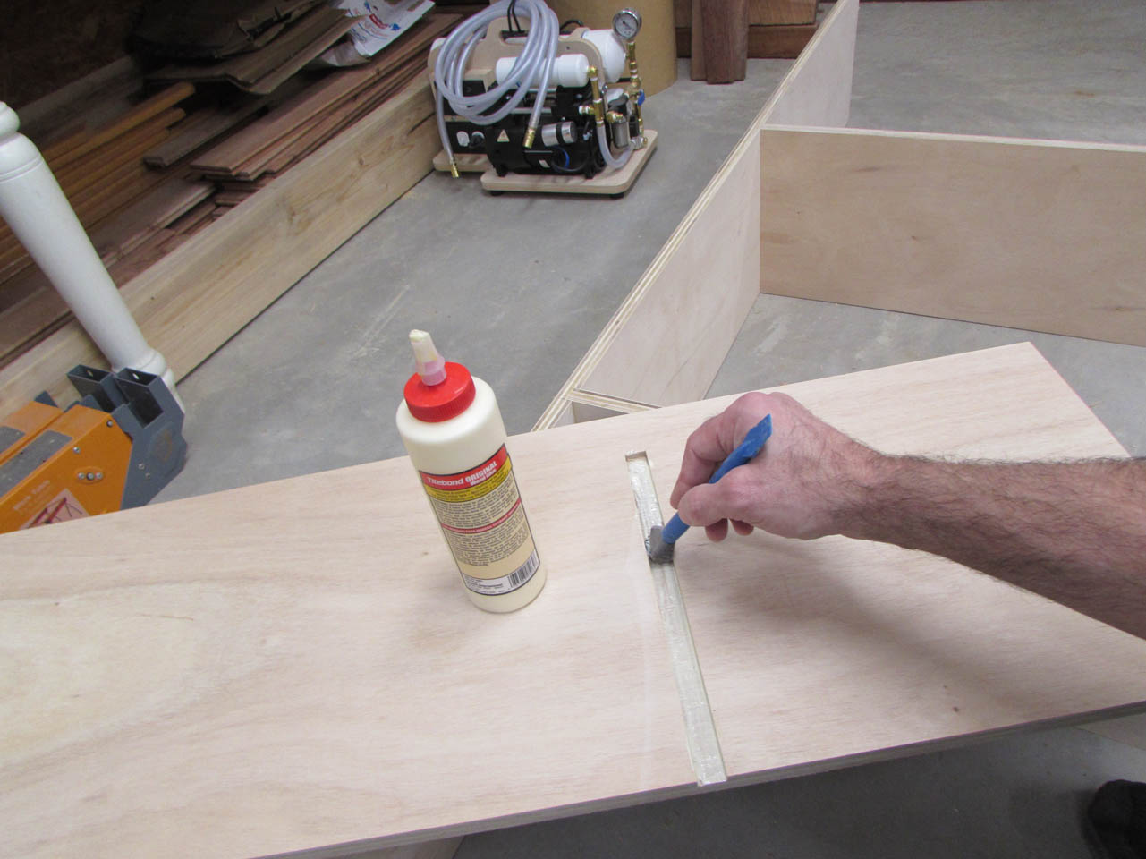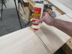To assemble the drawers, I apply glue to the ends of the 3/4″ plywood that will be my side pieces.