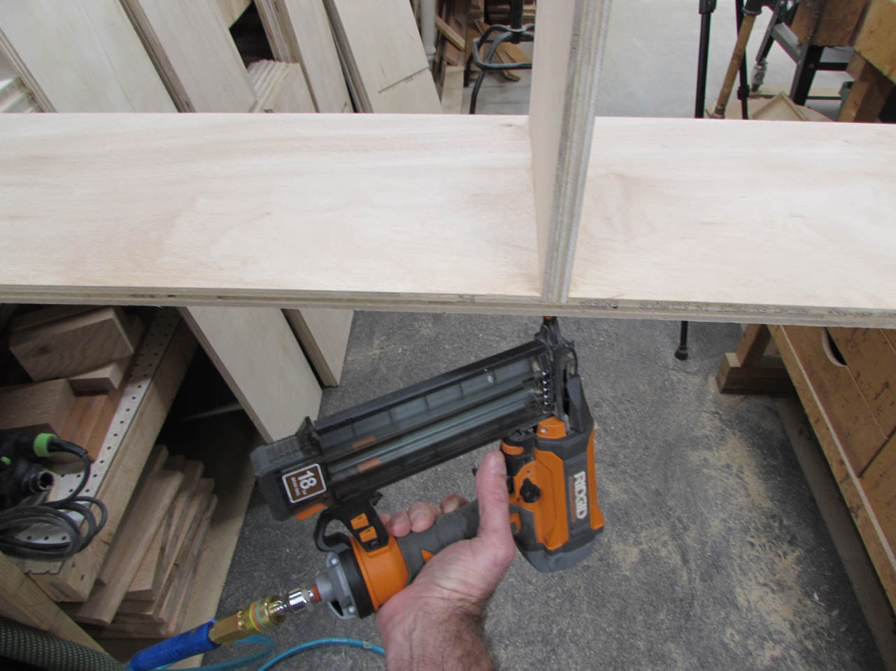 I apply glue to all three sides of the dados and insert the center drawer dividers, then hold them in place with a few 2″ brad nails.