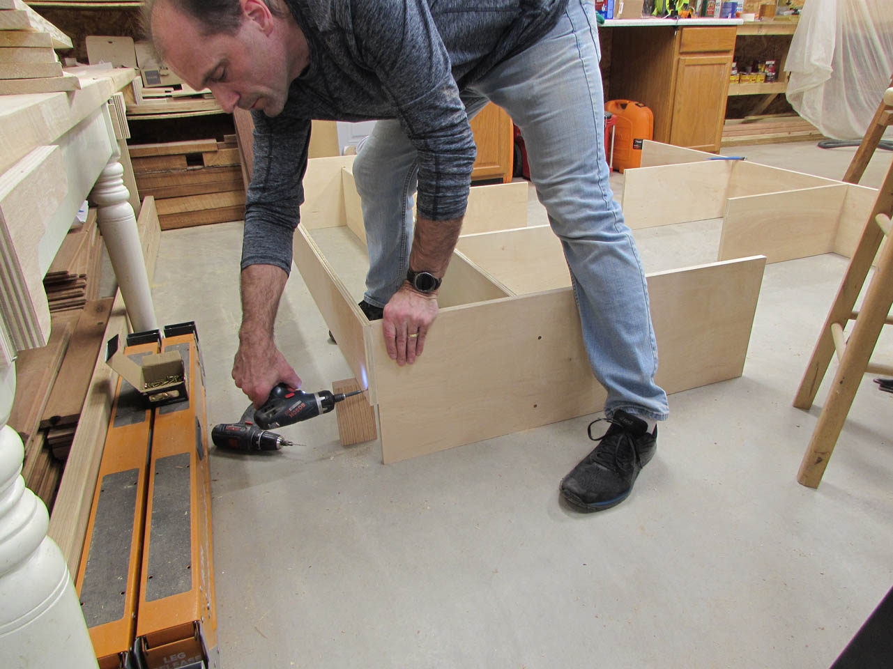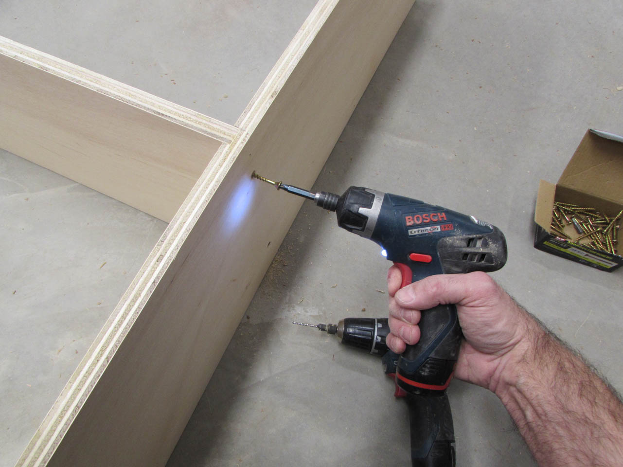 Next, I attach (3) 1-5/8″ wood screws down each side. The glue will hold the drawer together but the screws add additional strength which helps when kids stand on them… A drawer face will be attached later so the screws are not visible.