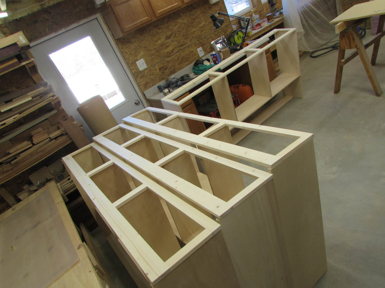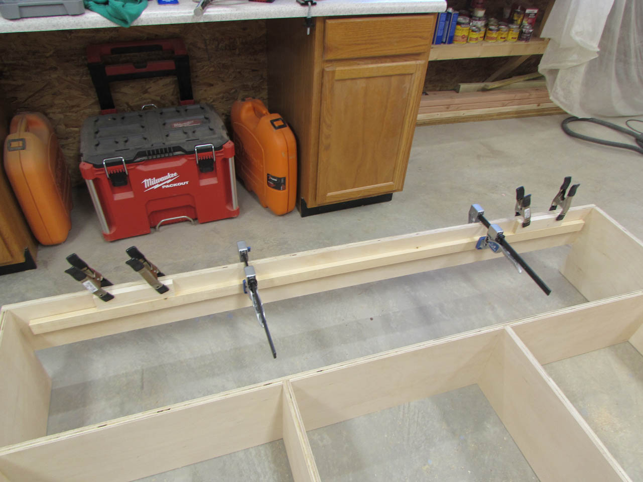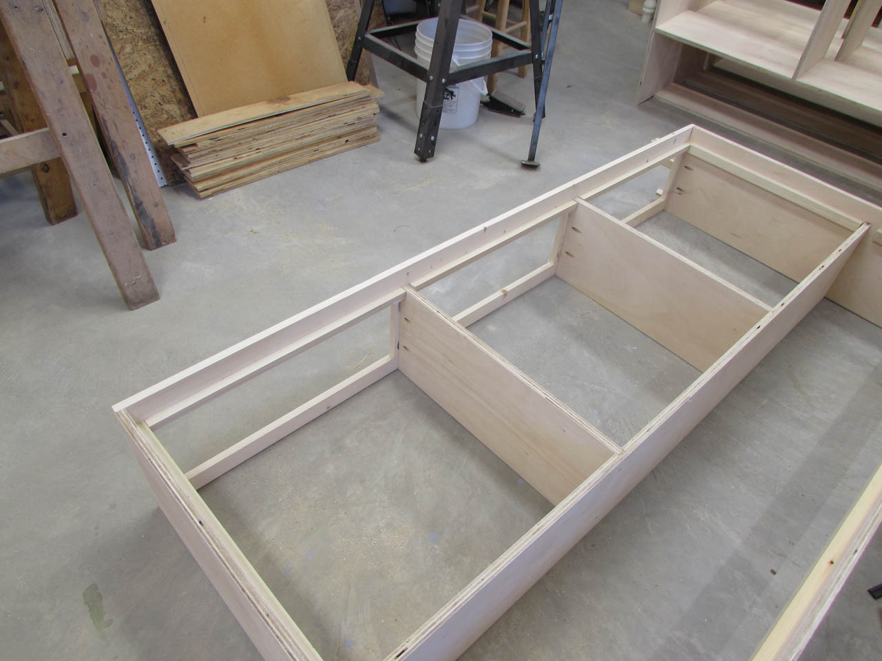 I assembled the rest of the face frames. I thought I had a problem with the first face frame for the two beds that only have two drawers. On these beds, the drawers are 1″ narrower. So there are two 23″ wide drawers on one side and a 25″ wide bay that will be blocked off for under-mattress access since the drawer would hit a wall where it will be located. I thought I built the first face frame backwards because I had the 25″ wide opening on the wrong side. Then, halfway through assembling the second one, I remembered that they were mirror opposites and I could just move that frame to the other bed. That saved a lot of re-work…