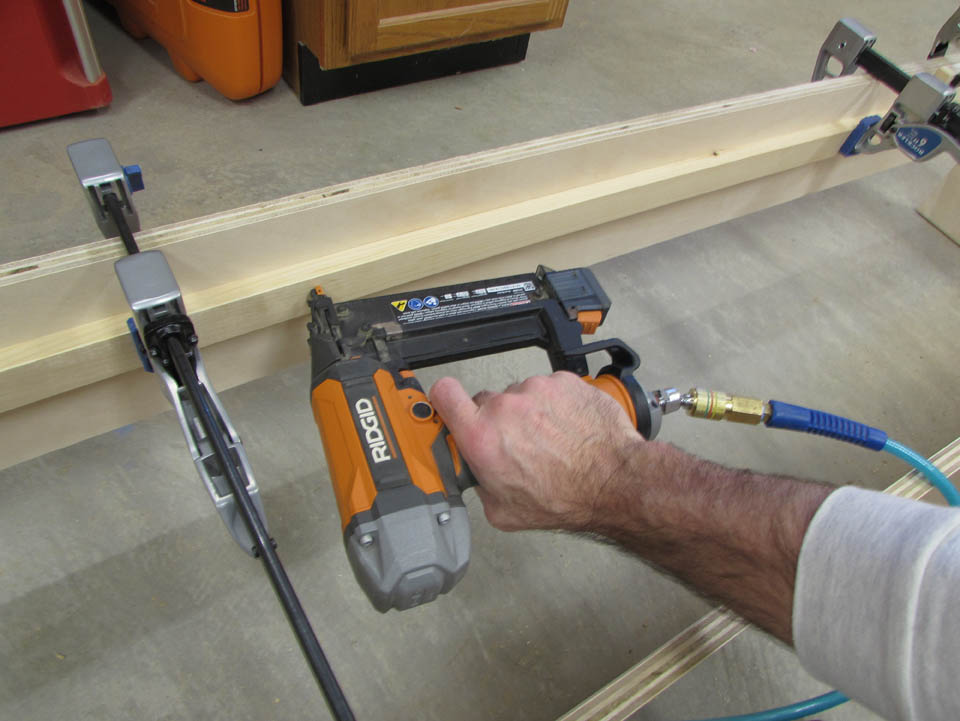 I bought a couple of 6′ long, 1″x2″ strips for this purpose. I applied some wood glue and clamped the strip in place while I used brad nails to hold it.