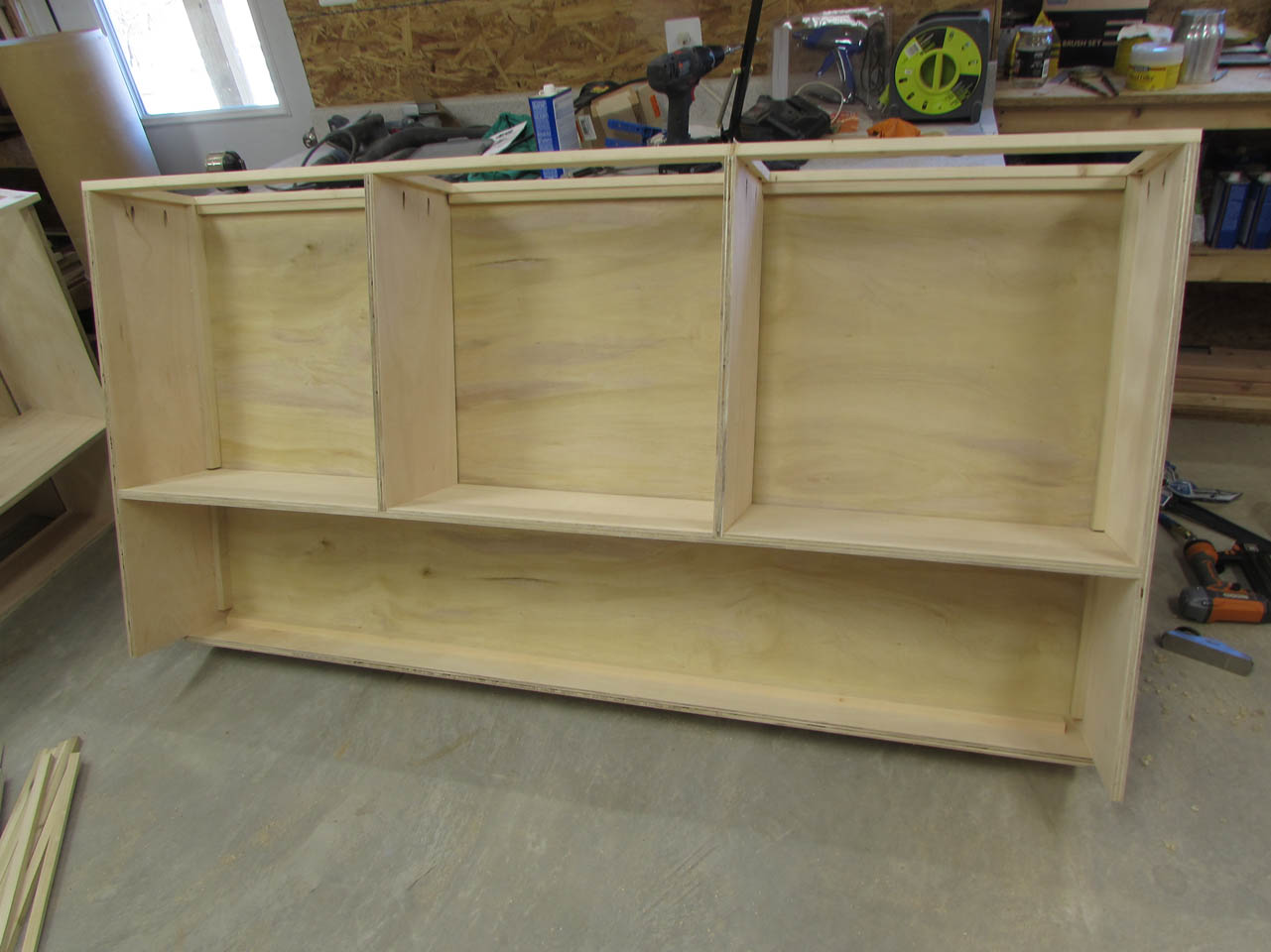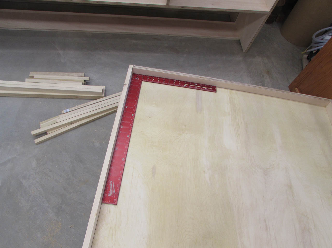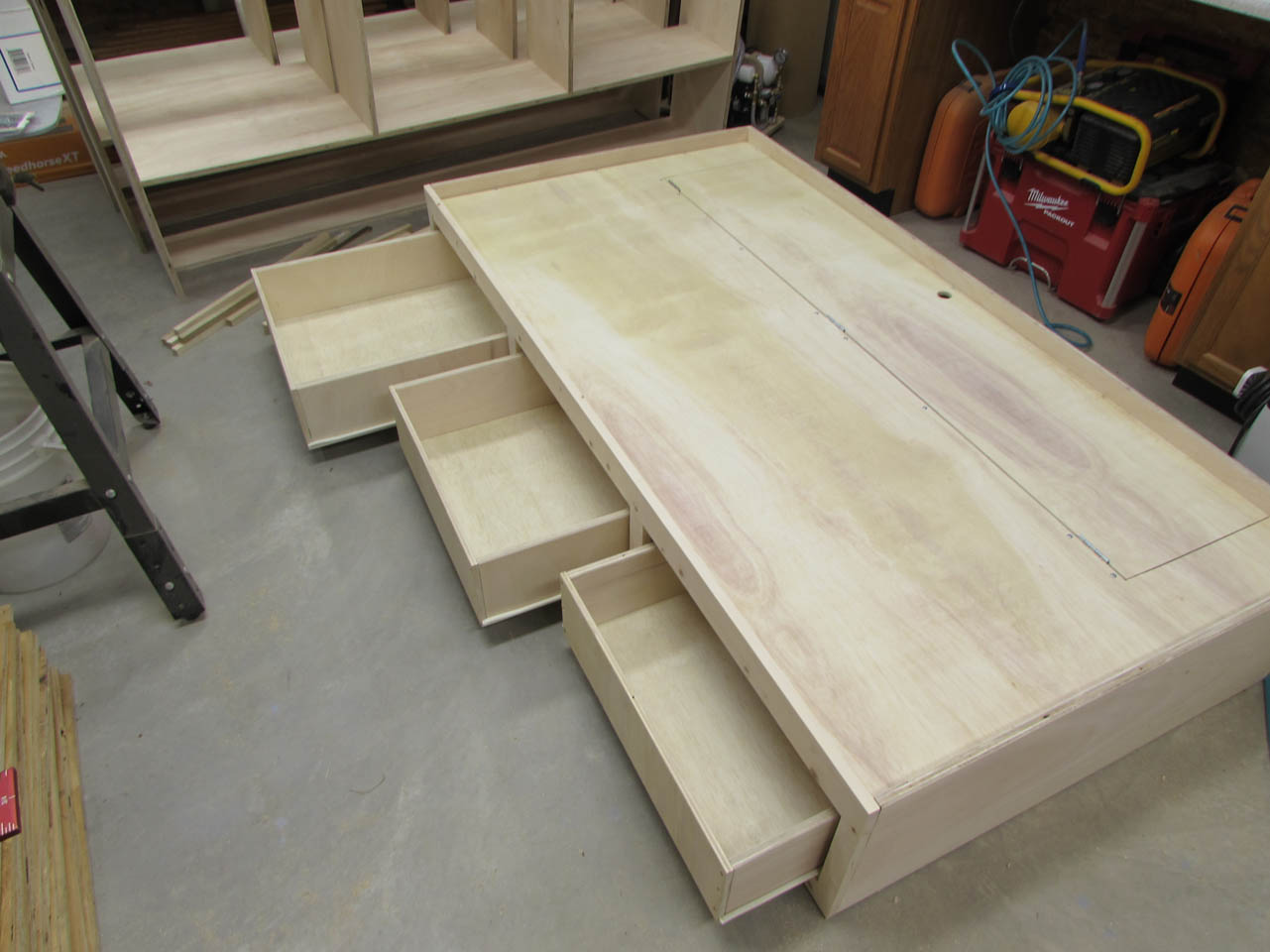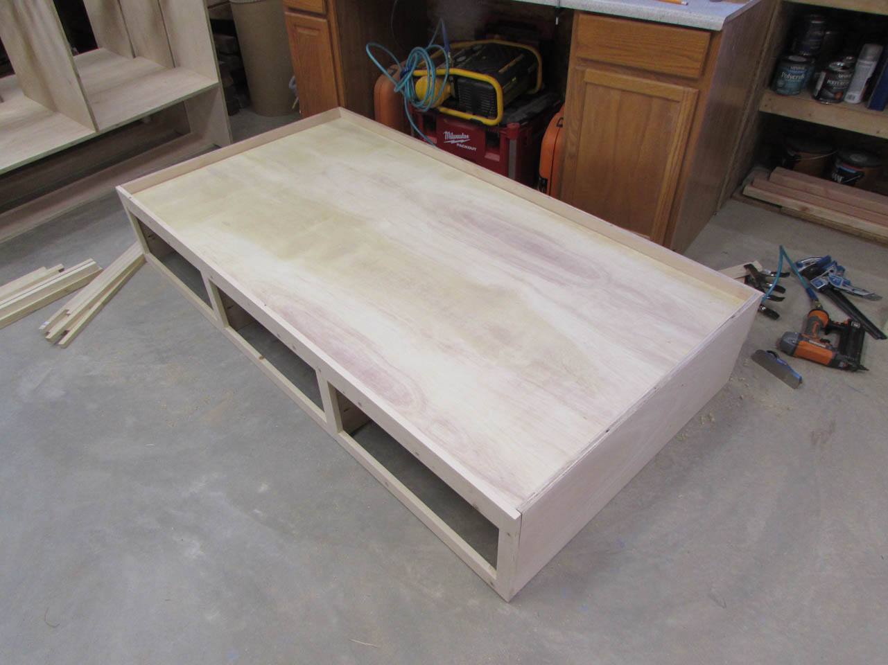 The first one is assembled but slightly out of square. The sheet of plywood will hold it square when it is installed, but I need to add blocking all the way around the edges to support the edges of the plywood in case someone wants to jump on the bed.