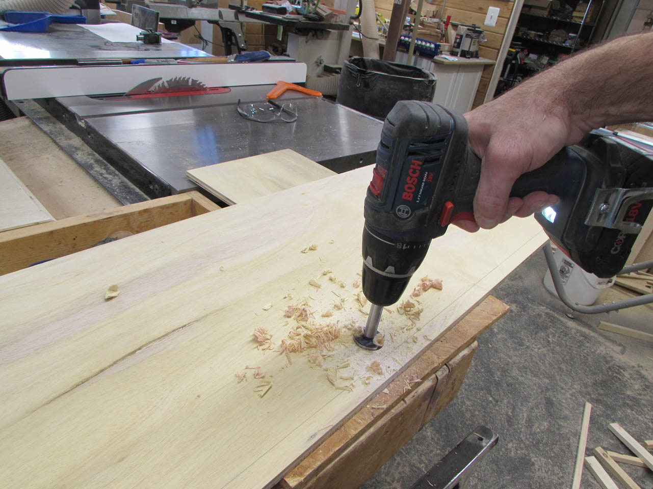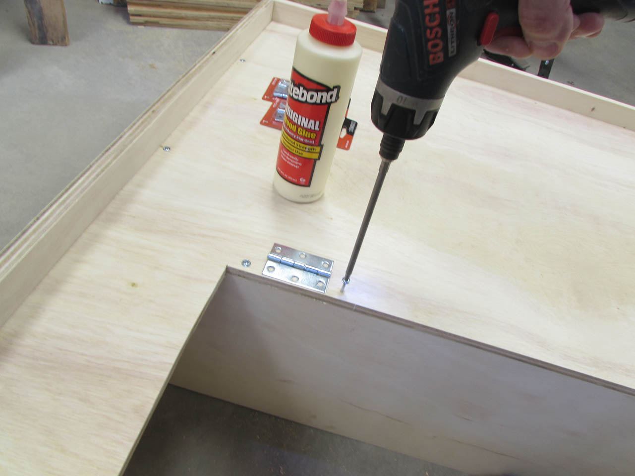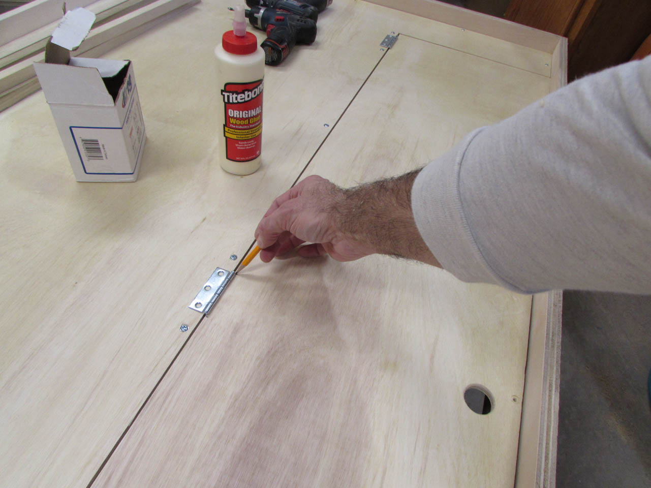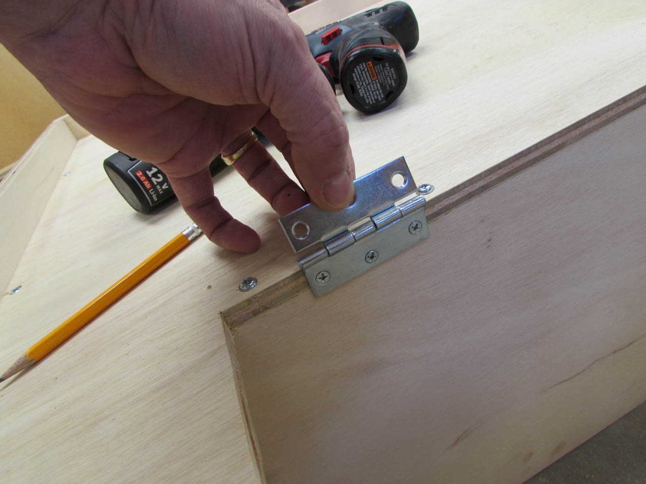 Since the hinges are designed for 3/4″ material, I add some fasteners on either side of the hinge locations, just to prevent separation if the screw is too close to the edge of the 1/2″ plywood.