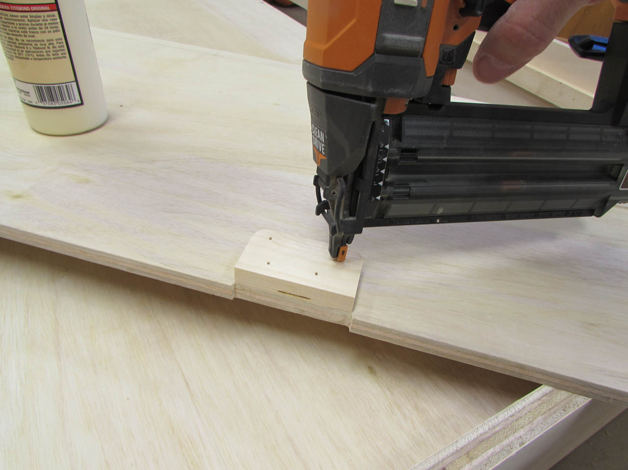 To thicken the door at the hinges, I made some blocks and attached them with glue and brad nails.