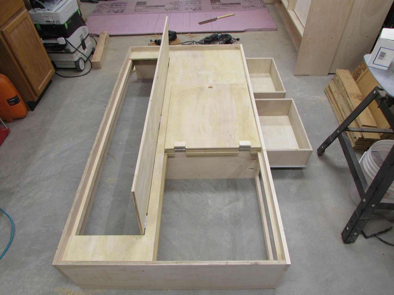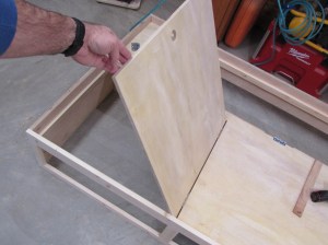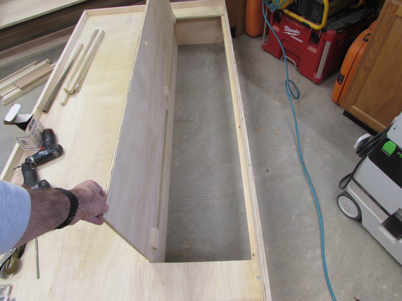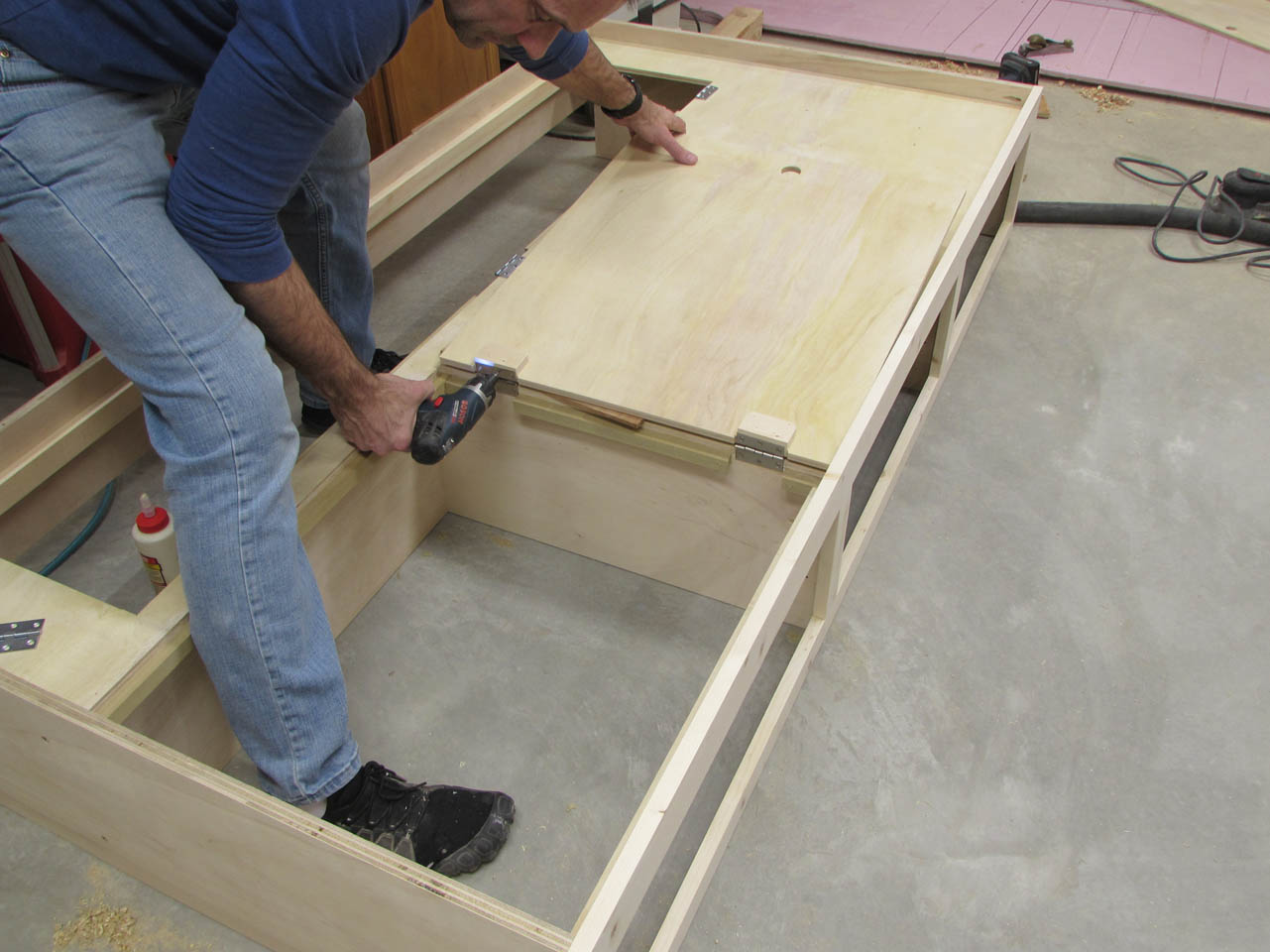 With the plywood in place, I can flip the bed on its rear and make the opening of the storage area. I used some 4″ spacers on the sides to leave a bit more plywood around the edges since that helps keep the bed square.